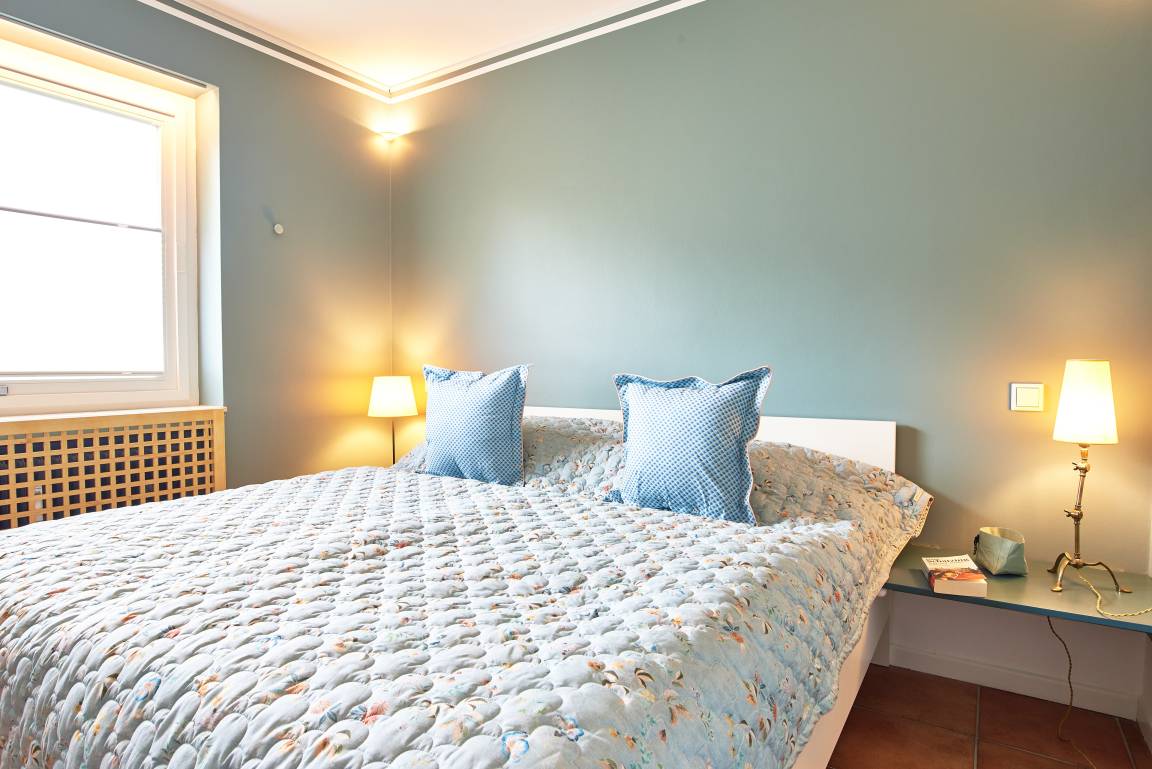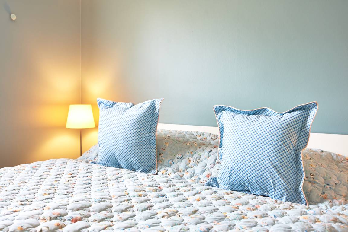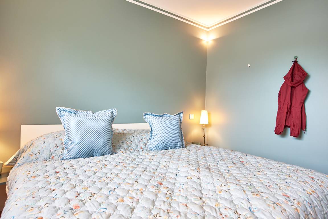Das Schlafzimmer mit offener Garderobe im nordischen Stil, wunderschönen maritimen Farben und romantischen Beleuchtungsmöglichkeiten sorgt für besondere Gemütlichkeit. (Die Matratzen sind 190 cm lang!) In einem Einbau-Fach über der Garderobe finden Sie weitere Kissen und Decken.