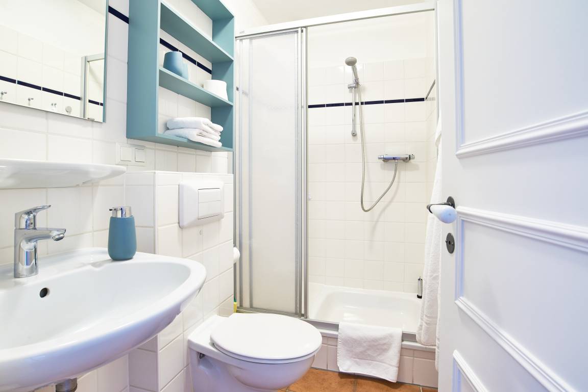 Das kleine Badezimmer mit großzügiger Dusche und WC liegt zwischen den beiden Zimmern und ist ebenfalls über den Flur erreichbar.