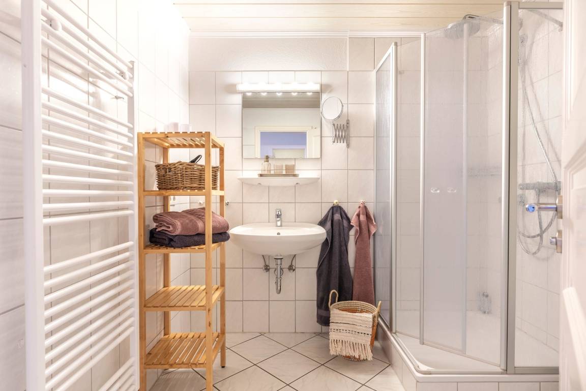 Das Badezimmer ist mit einer Dusche, WC, Fön und Waschbecken versehen.