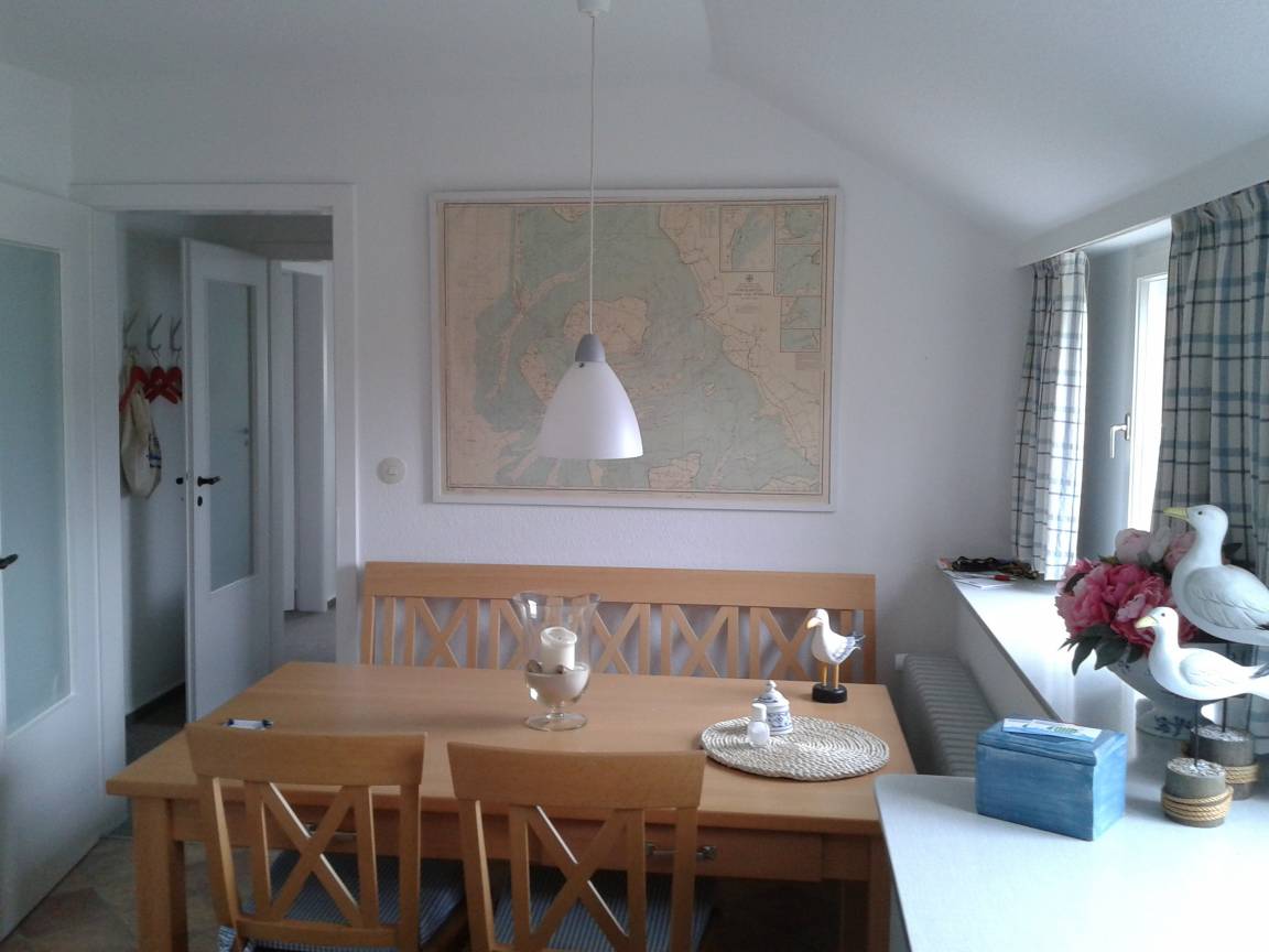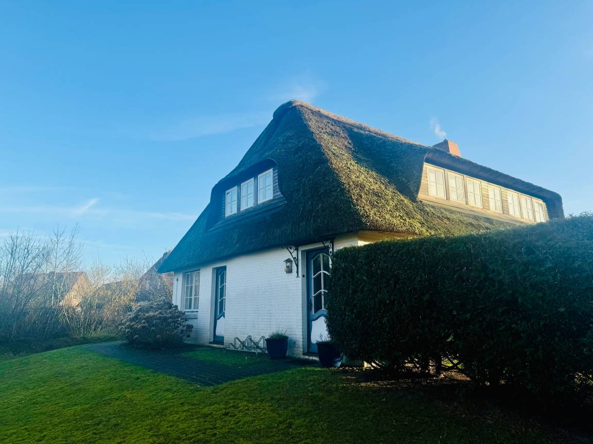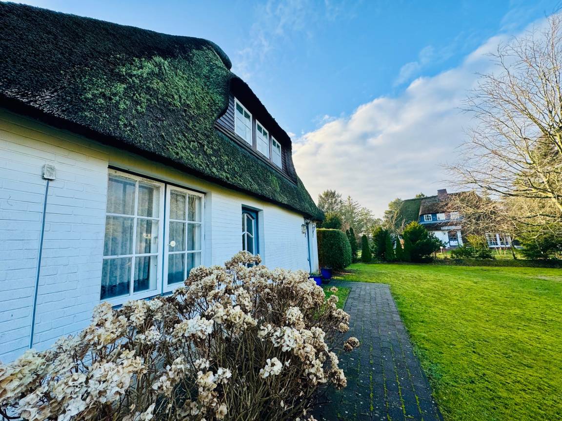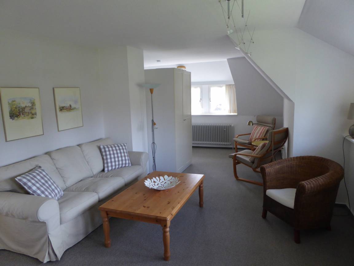 Auf einem sonnigen Gartengrundstück am Ende einer Sackgasse liegt die schöne und ruhige Ferienwohnung in Nieblum/Föhr. Die großzügig geschnittene Wohnung im 1. Obergeschoß bietet Platz für 4 Personen plus Kleinkind.