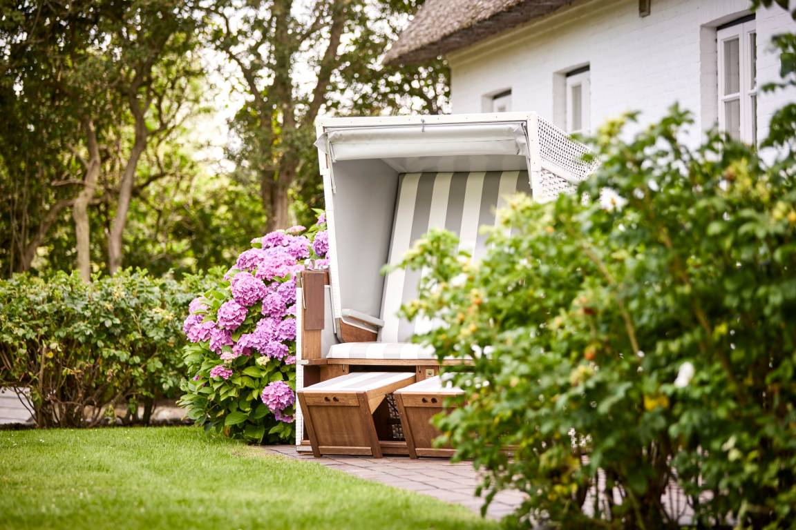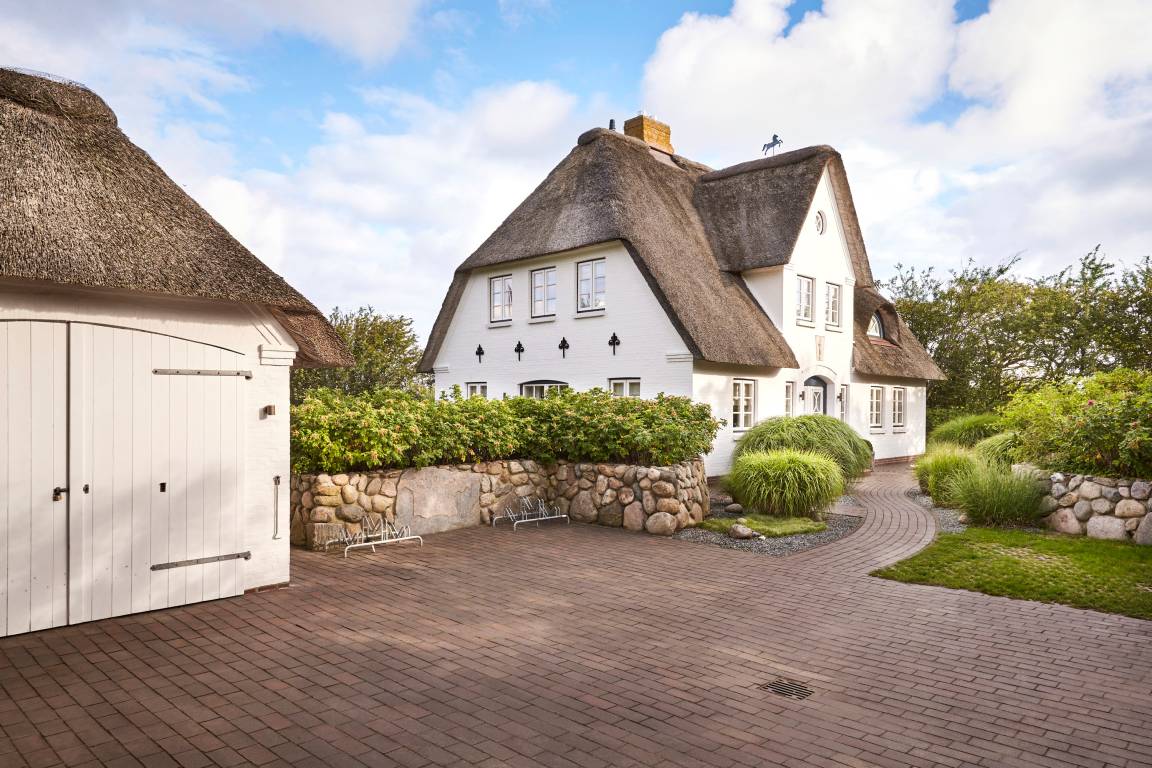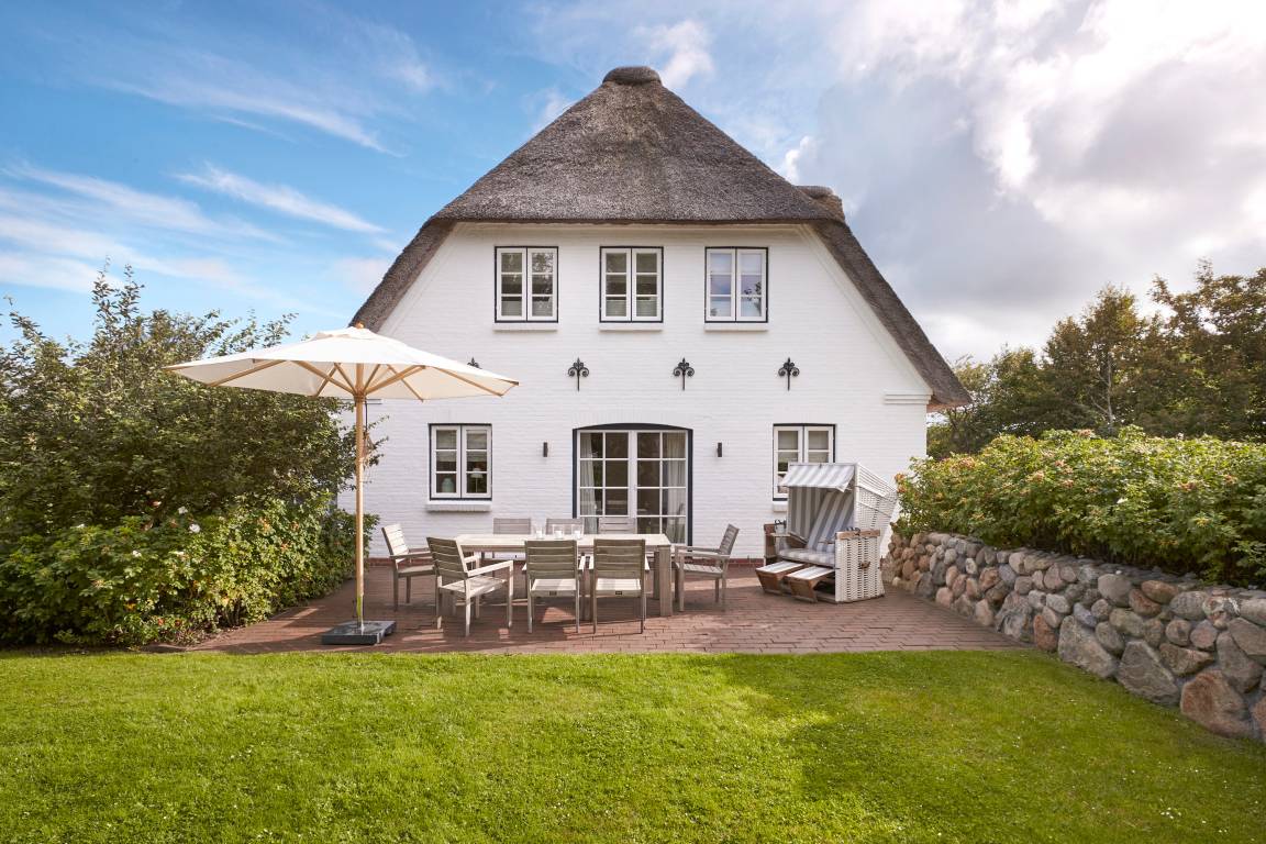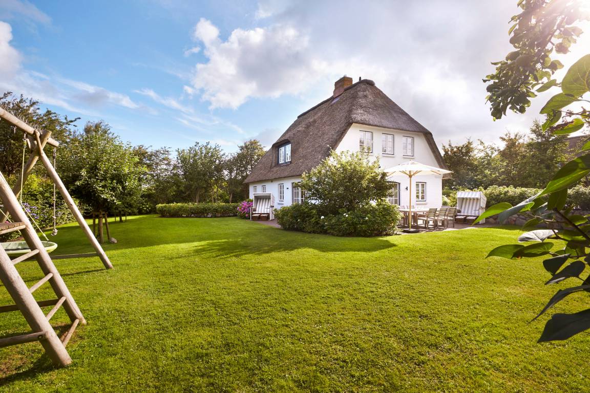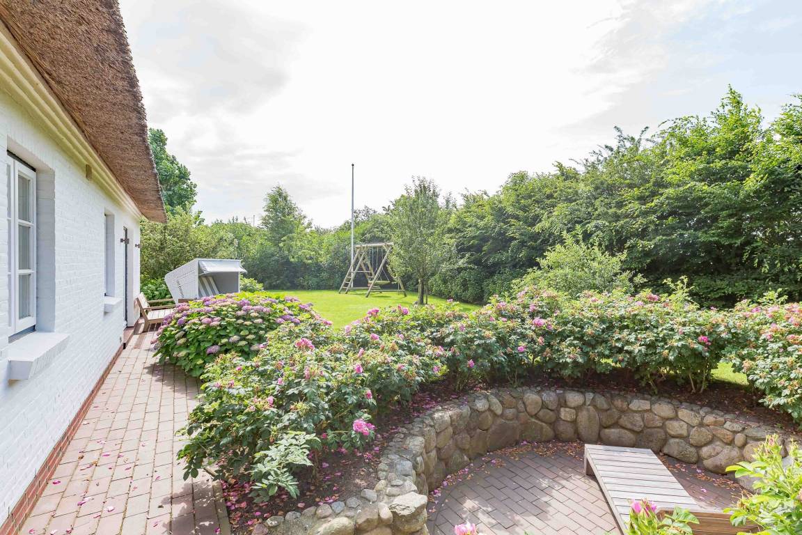 Über eine kleine private Stichstraße erreichen Sie dieses wunderschöne Reetdachhaus im idyllischen Inseldorf Nieblum, das auf einem ca. 1.500 m² großen, weitläufigen und sonnigen Grundstück steht. Das Haus bietet einen grossen, eingewachsenen Garten mit umlaufender Frühstücks-und Sonnenterrasse. Zum Entspannen stehen dort auch zwei Strandkörbe. Der wundervoll angelegte Garten dieser ehemals historischen Anlage bietet durch Friesenwälle und eine Sonnenkuhle maximale Privatsphäre. Eine stimmungsvolle abendliche Illumination komplettiert dieses außergewöhnliche Ambiente. Ausserdem haben Sie zwei PKW-Parkplätze direkt auf dem Grundstück.