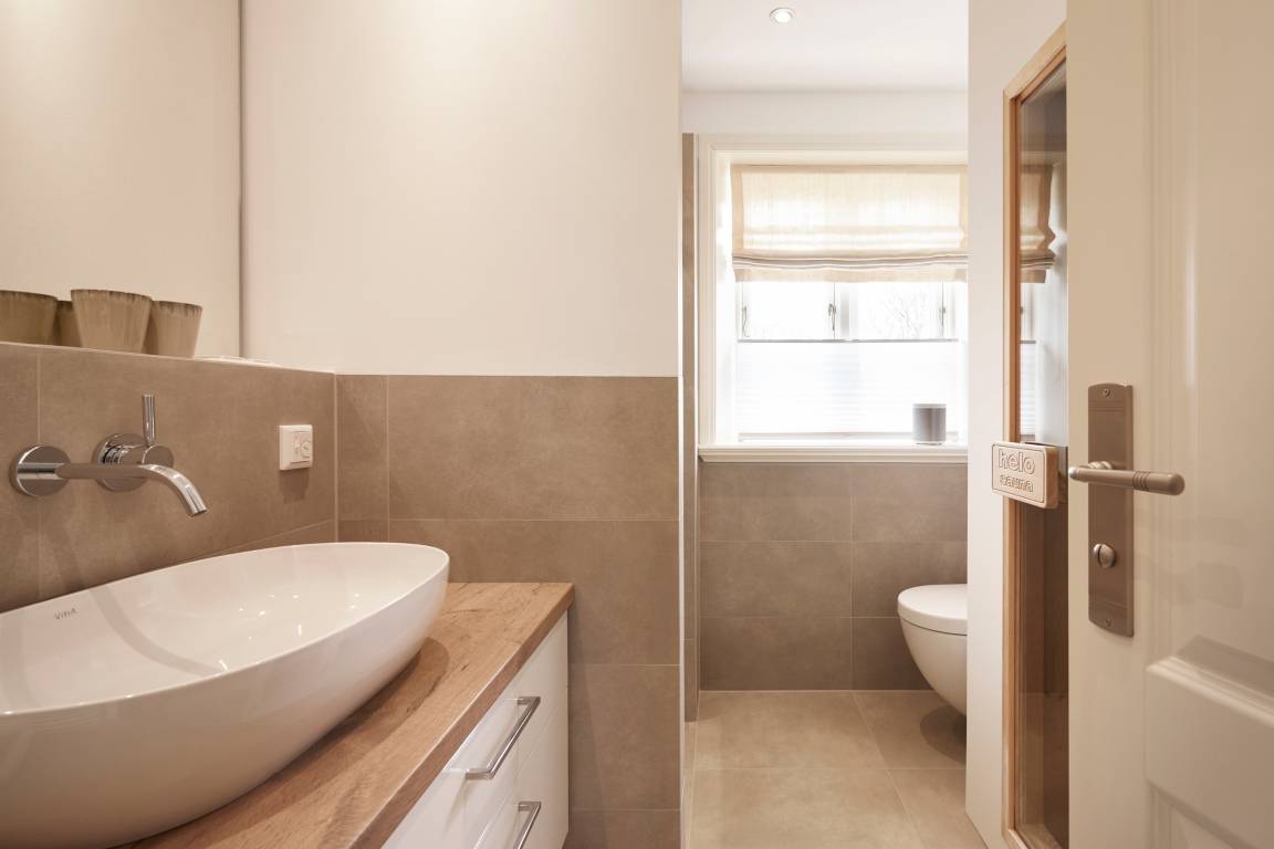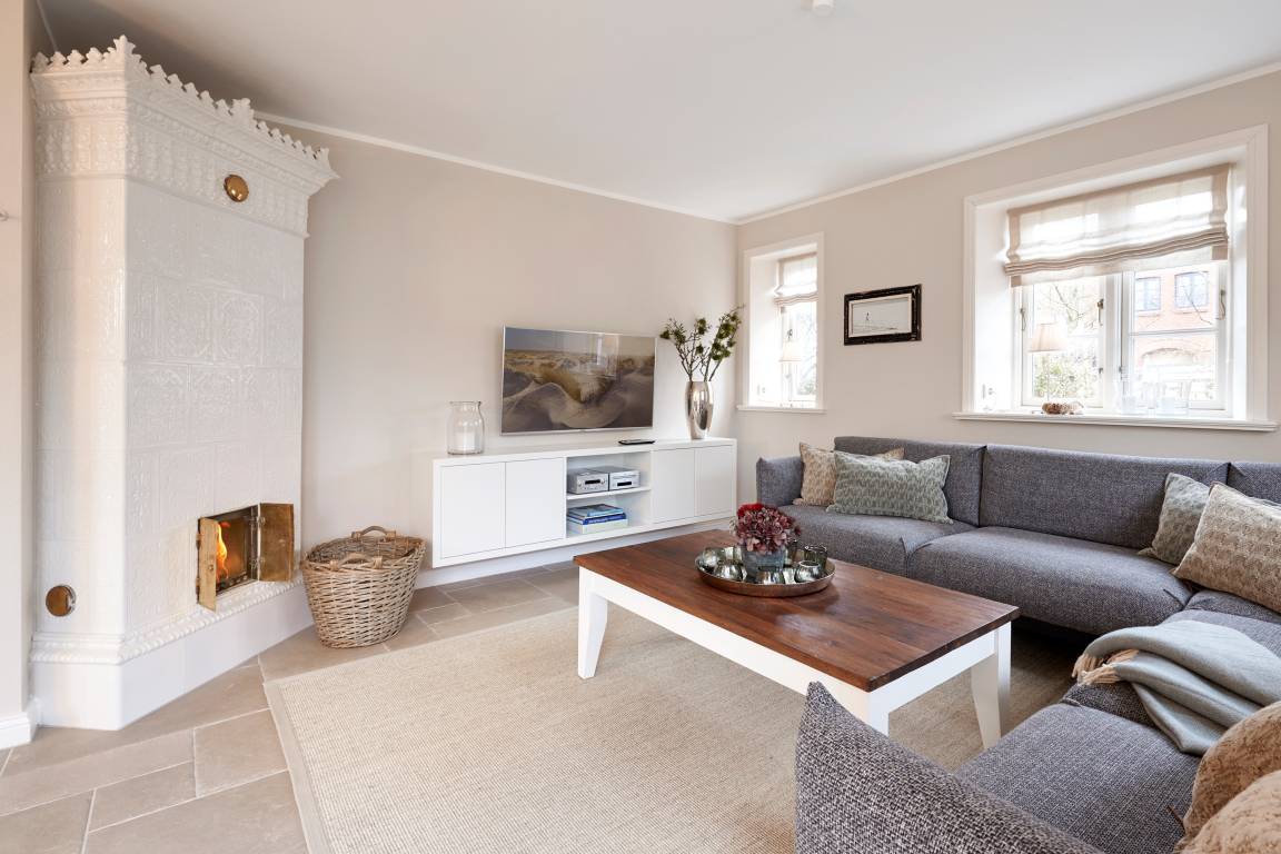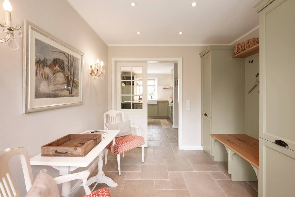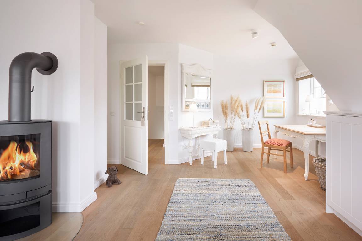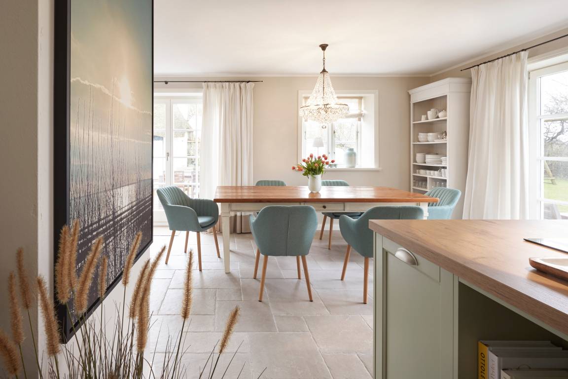 Auch im Haus ist an alles gedacht, was den Aufenthalt angenehm und zu einem besonderen Erlebnis macht. Die stilvolle Einrichtung des lichtdurchfluteten Landhauses in harmonischer Farbgestaltung verbindet Tradition, Moderne und Gemütlichkeit und verbreitet gleichzeitig Ruhe und Exklusivität. Ein Highlight ist sicherlich die technisch perfekt ausgestattete , offene Küche mit grossem Küchenblock, der zu entspannter Geselligkeit einlädt. Das Wohn-und Esszimmer mit einem edlen, englischen Limestone Boden mit Fussbodenheizung gibt dem Landhaus seinen besonderen Charakter. Für gemütliche Stunden in der kalten Jahreszeit wärmt Sie ein historischer Kachelofen im Wohnzimmer. Eins von drei Schlafzimmern befindet sich im Erdgeschoss , zwei weitere im Obergeschoss. Das Haus verfügt insgesamt über drei hochwertige Bäder mit modernen Duschen sowie eine kleine, aber feine Sauna. Der große Spitzboden kann als Relax- oder Kinderspielzone genutzt werden oder bietet zwei kleinen Personen eine bequeme, zusätzliche Schlaflösung. Das Haus hat in allen Bereichen eine sehr wertige Ausstattung und bietet beste Voraussetzungen für einen entspannten Urlaub.