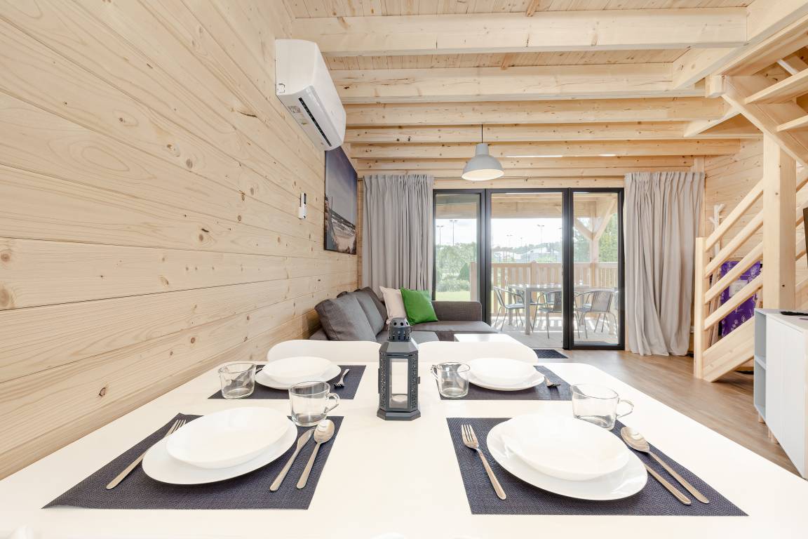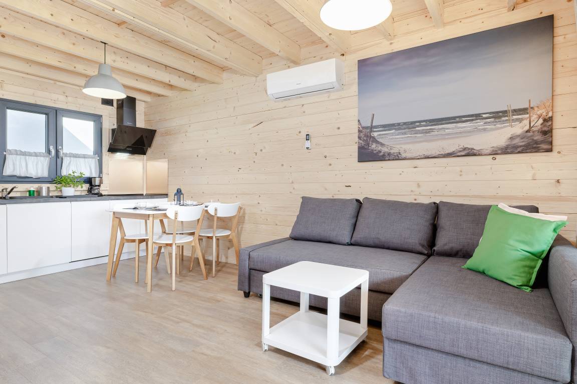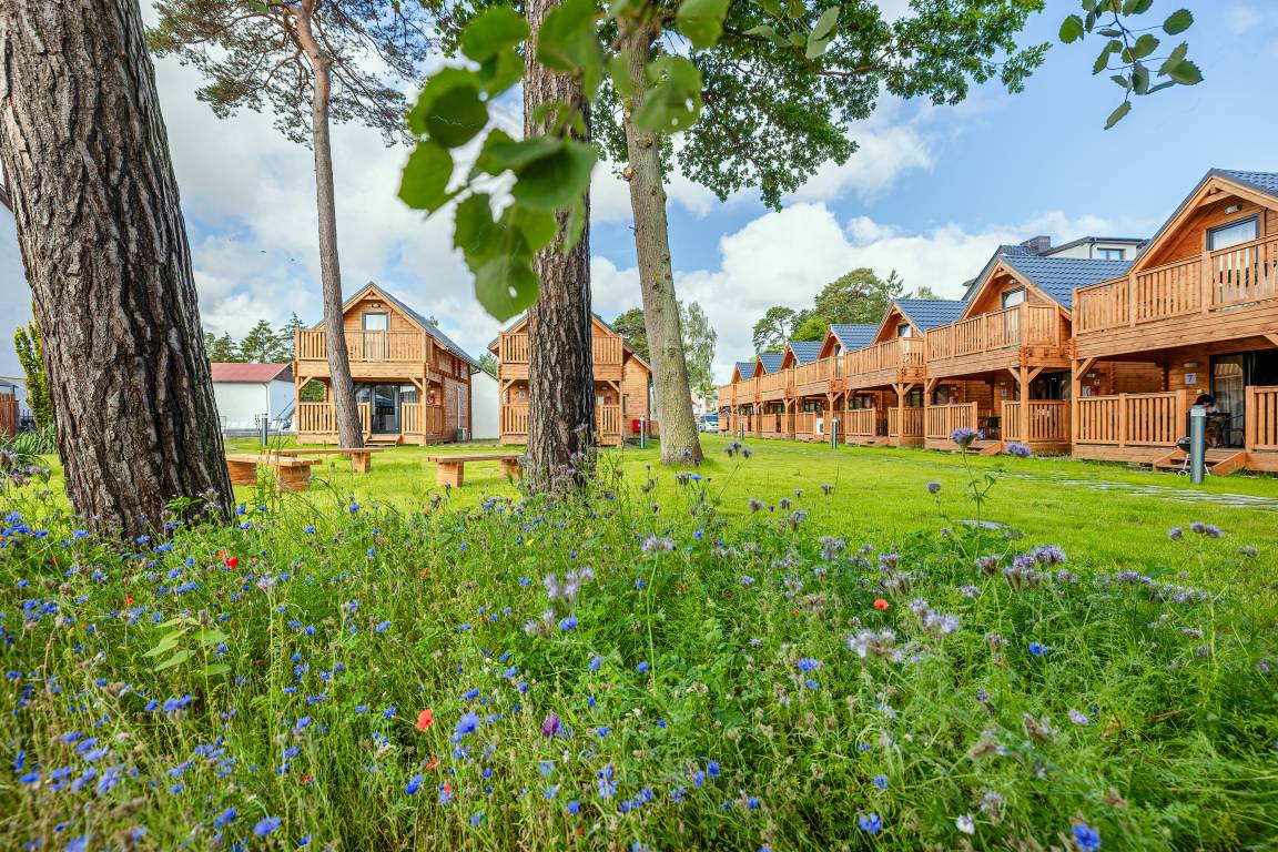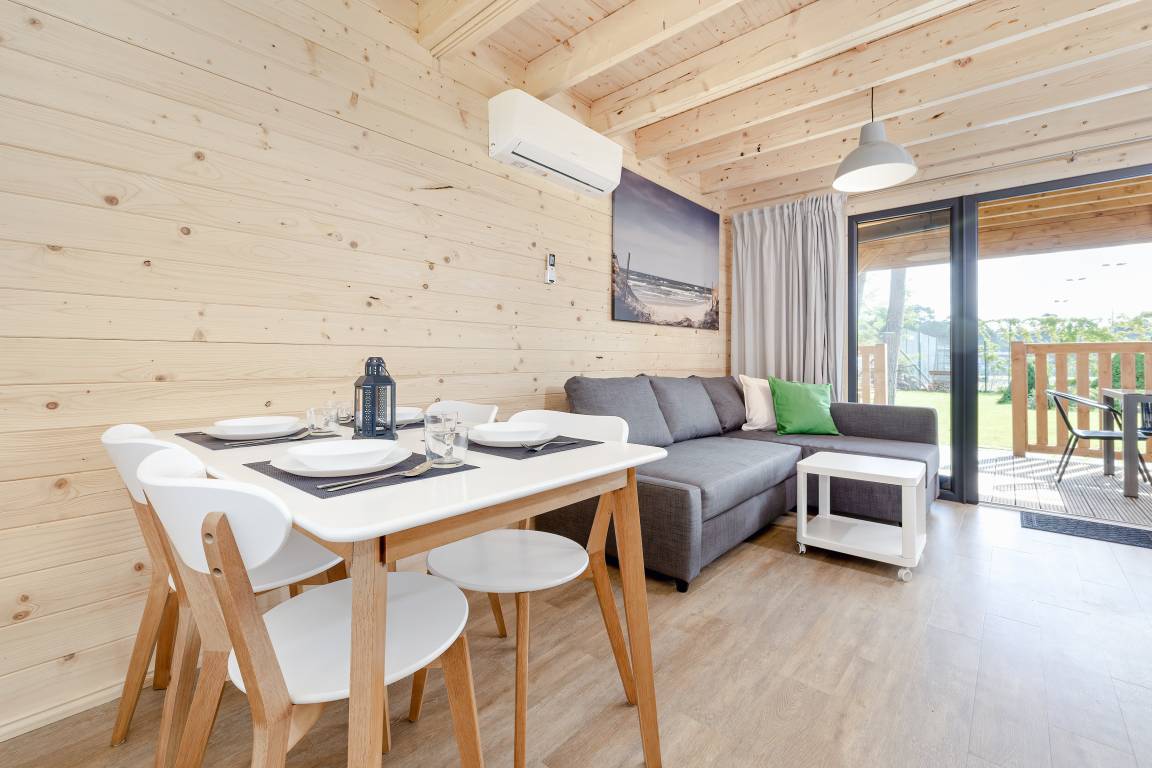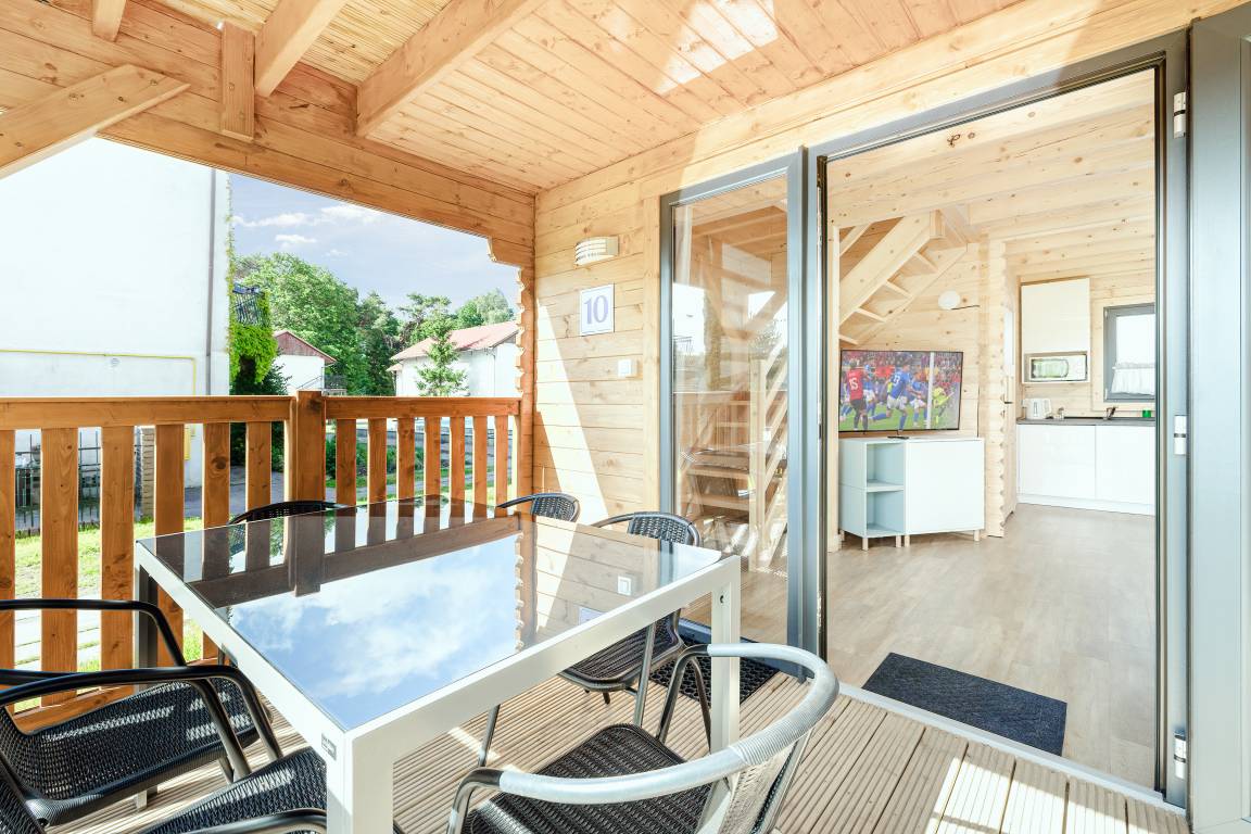 PL 34.19 Ferienhaus 2-6 Pers.: Helles 3-Zimmerhaus mit 57 qm Wohnfläche über 2 Etagen. Parterre: lichtdurchfluteter Wohn-/Essraum mit bodentiefen Fenstern, Couchgarnitur (Schlafsofa für 2 Pers.), Flachbild TV, Internet über W-Lan, Esstisch, gut ausgestattete Küchenzeile (4 Pl. Ceranfeld, Mikrowelle, Dunstabzug, Spülmaschine). Bad/WC. Dachgeschoss: zwei Doppelzimmer, eines davon mit Balkon. Überdachte Terrasse mit Sitzmöbeln und Grill, davor Grünfläche.