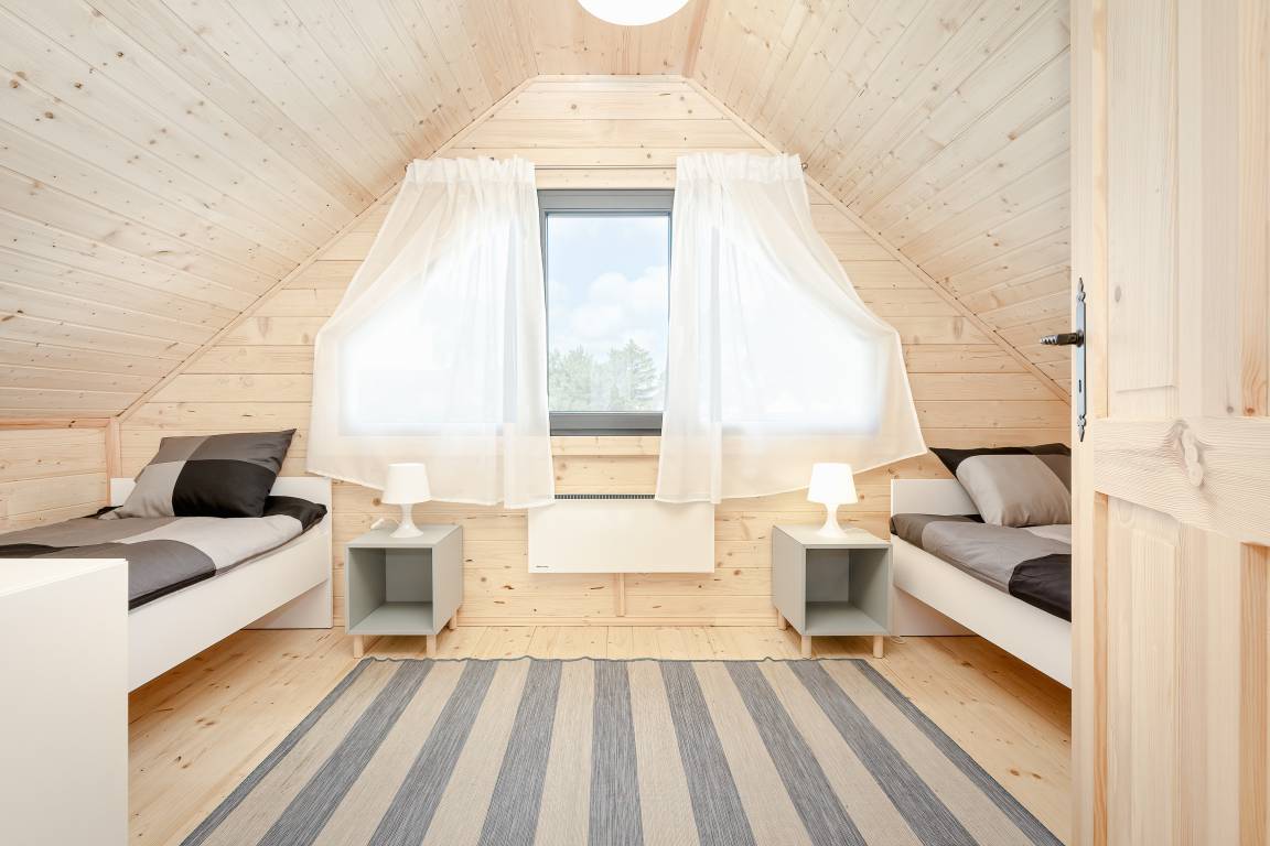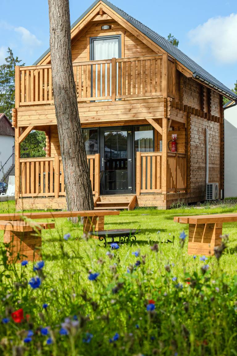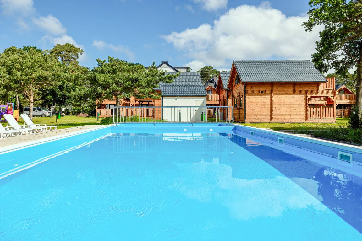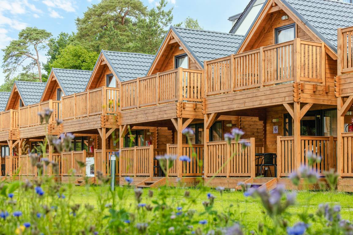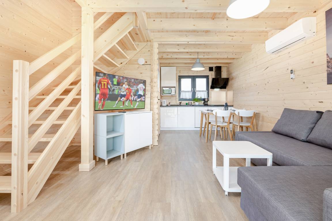 Haus: Schöne Ferienhausanlage mit 11 Ferienhäusern auf einem 2,5 ha großem Rasengrundstück, 2024 neu erbaut. Großzügige Holzhäuser mit moderner Einrichtung. Nichtraucherhaus. Rustikal gemütliches Flair durch Holzbalkendecken. Heizung mit E-Radiatoren, Klimaanlage mit Heizfunktion im Wohn/Essraum. Warmwasser über E-Boiler (65 l.). Balkon. Überdachte Terrasse mit Sitzmöbeln, Grill. 1 Parkplatz/ Ferienhaus auf umzäuntem Grundstück inklusiv.