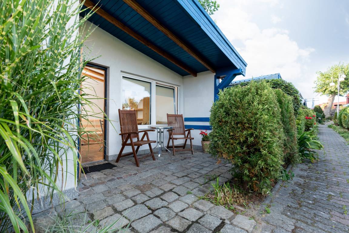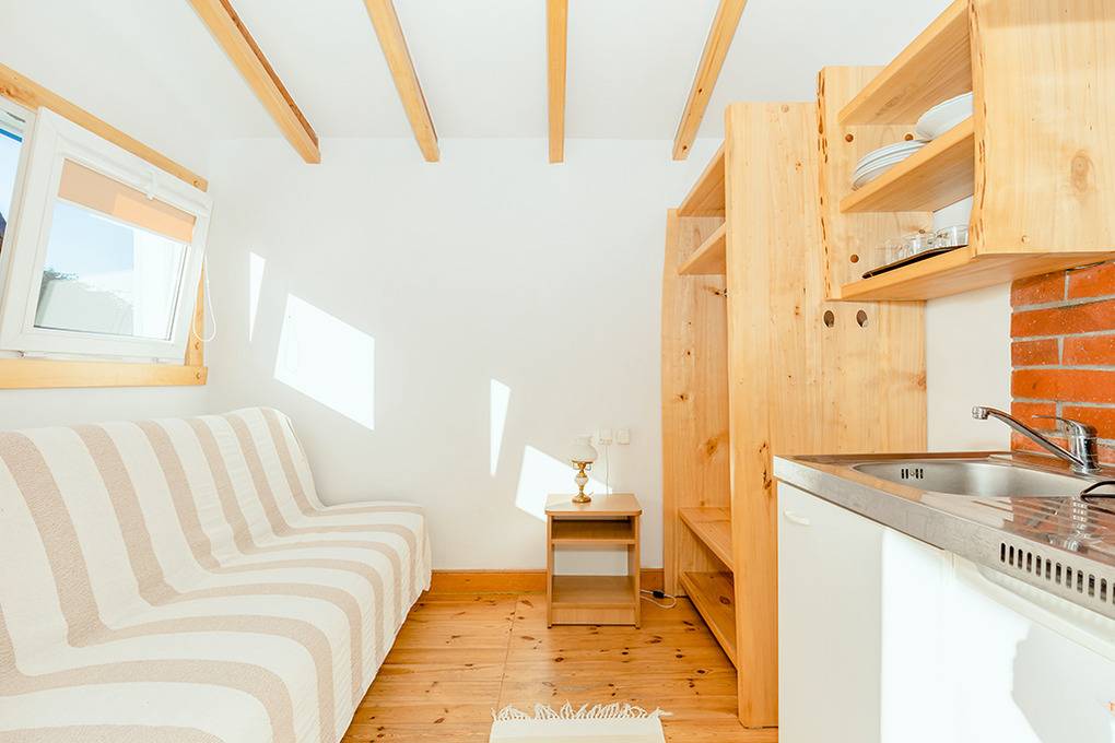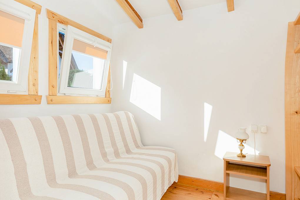 PL 34.23 Ferienhaus 1-4 Pers.: Gemütliches 2-Zimmerhaus mit ca.30 qm Wohnfläche. Wohn-/Essraum mit Kamin, 2 Sofas (Schlafcouch 2 Pers.), kleinem Tisch, Sat-TV mit deutschen Programmen. Doppelzimmer mit Schlafsofa (2 Pers.), Pantryküche (2 E-Platten, Abzugshaube). Bad/WC. Schöne überdachte Terrasse mit Sitzmöbeln.