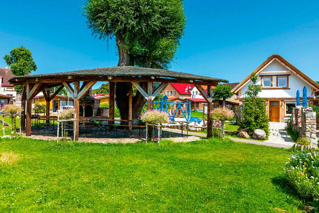 Haus: Gepflegte Ferienhausanlage mit kleinen, gemütlichen Bungalows. Heizung durch Kaminofen. Warmwasser über E-Boiler (50 l). Überdachte Terrasse mit Sitzmöbeln. In der gepflegten Anlage: Kleines Restaurant. Kinderspielplatz mit Schaukel, Rutsche, Klettergerüst, Sandkasten. Pavillon mit großem Grill, Sitzplätzen zur gemeinschaftlichen Nutzung. Parkplatz auf dem umzäunten Grundstück.