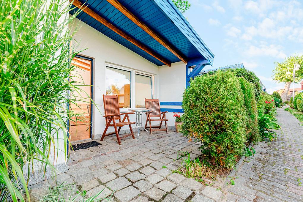 PL 34.23 Ferienhaus 1-4 Pers.: Gemütliches 2-Zimmerhaus mit ca.30 qm Wohnfläche. Wohn-/Essraum mit Kamin, 2 Sofas (Schlafcouch 2 Pers.), kleinem Tisch, Sat-TV mit deutschen Programmen. Doppelzimmer mit Schlafsofa (2 Pers.), Pantryküche (2 E-Platten, Abzugshaube). Bad/WC. Schöne überdachte Terrasse mit Sitzmöbeln.
