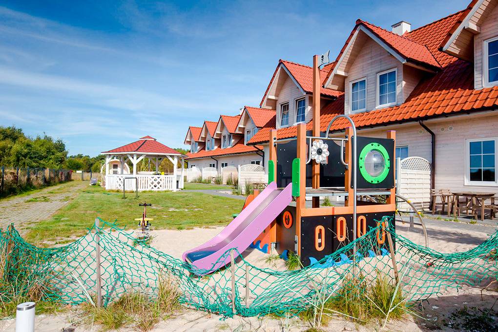 Haus: Gepflegte Ferienhausanlage auf einem großzügigen, umzäunten Grundstück, Kinderspielplatz mit Schaukel, Sandkasten.