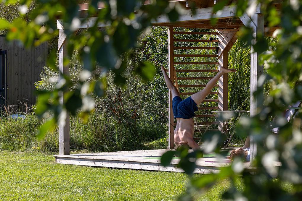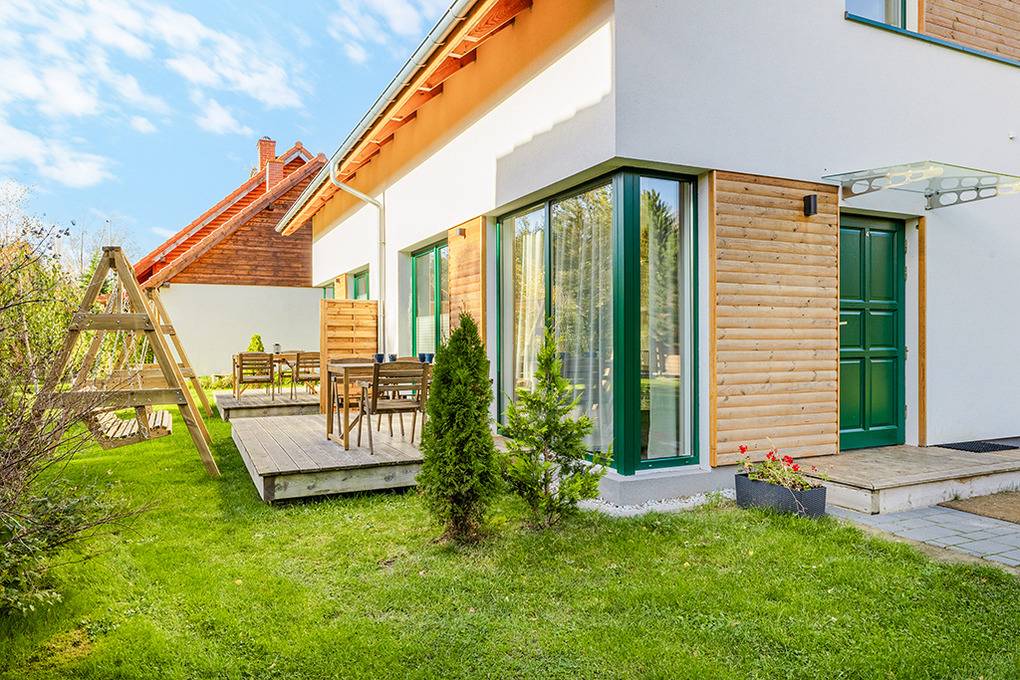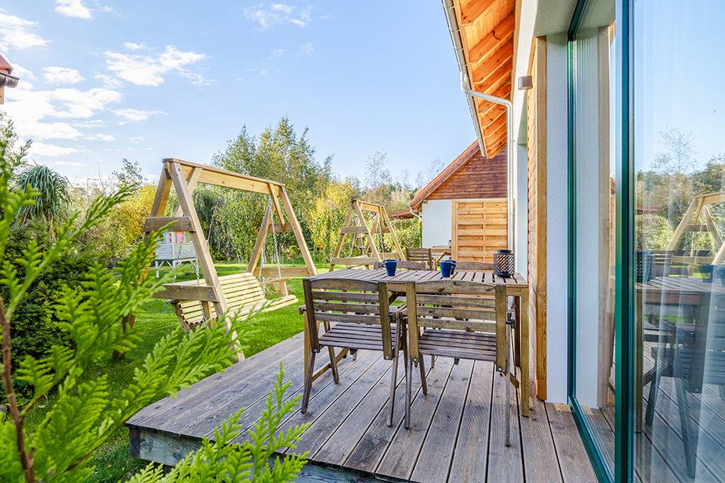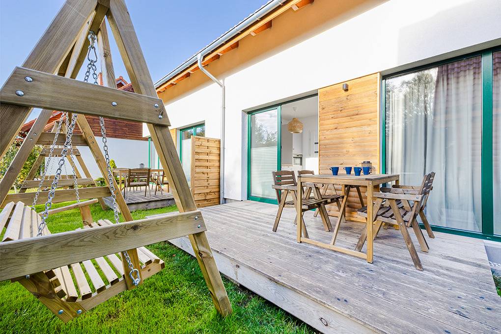 Haus: Komfortable Reihenhäuser mit geschmackvoller Einrichtung. In der weitläufigen Anlage: Separates Saunahäuschen mit Relax-Terrasse. Angelteich. Grillplatz. Waschmaschine. Großer Garten mit Kinderspielplatz (Schaukel, Rutsche, Sandkasten). 5 Fahrräder ausleihbar. Parkplatz auf dem umzäunten Grundstück.