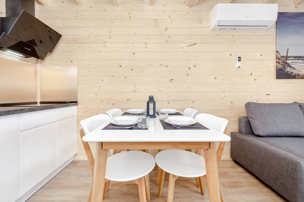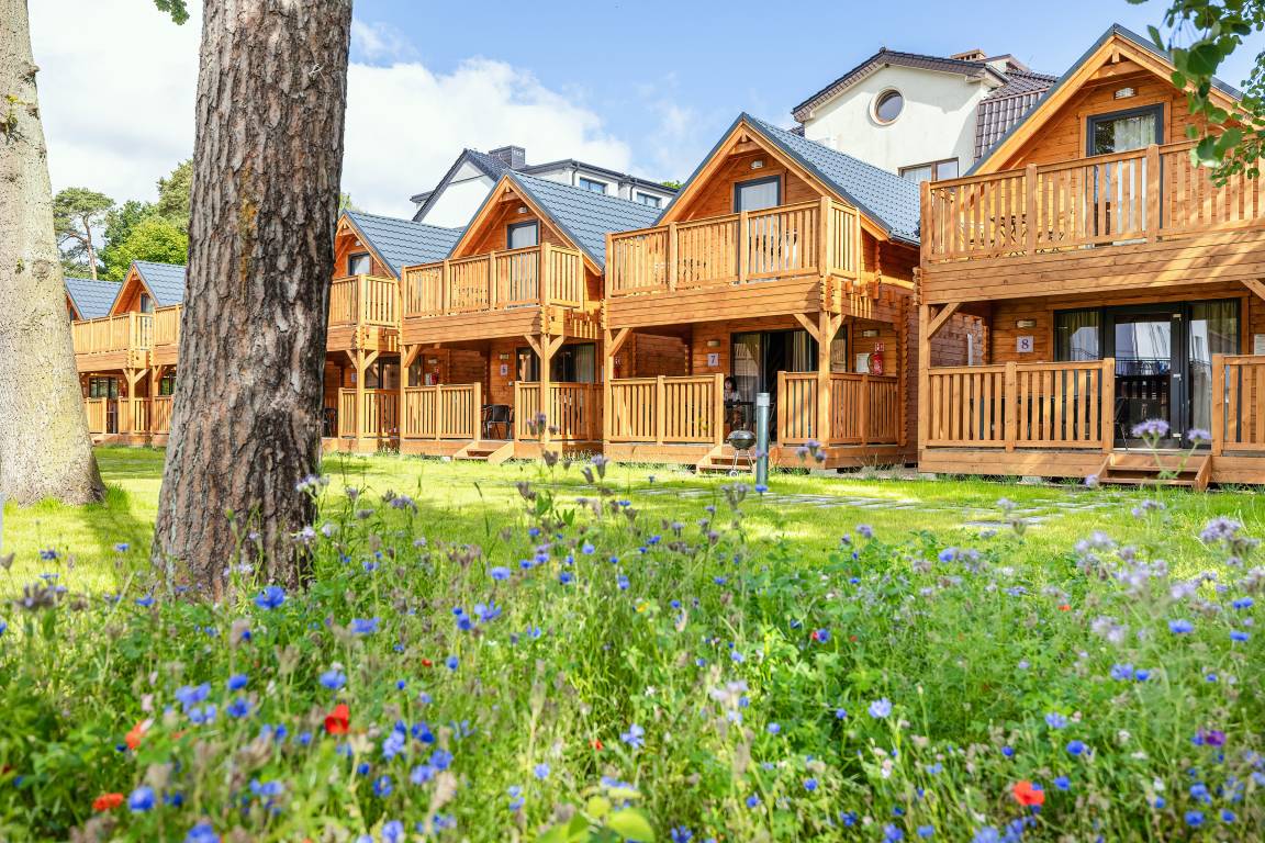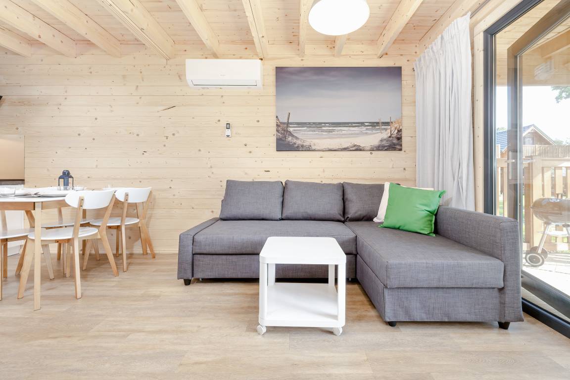 PL 34.19 Ferienhaus 2-6 Pers.: Helles 3-Zimmerhaus mit 57 qm Wohnfläche über 2 Etagen. Parterre: lichtdurchfluteter Wohn-/Essraum mit bodentiefen Fenstern, Couchgarnitur (Schlafsofa für 2 Pers.), Flachbild TV, Internet über W-Lan, Esstisch, gut ausgestattete Küchenzeile (4 Pl. Ceranfeld, Mikrowelle, Dunstabzug, Spülmaschine). Bad/WC. Dachgeschoss: zwei Doppelzimmer, eines davon mit Balkon. Überdachte Terrasse mit Sitzmöbeln und Grill davor Grünfläche.