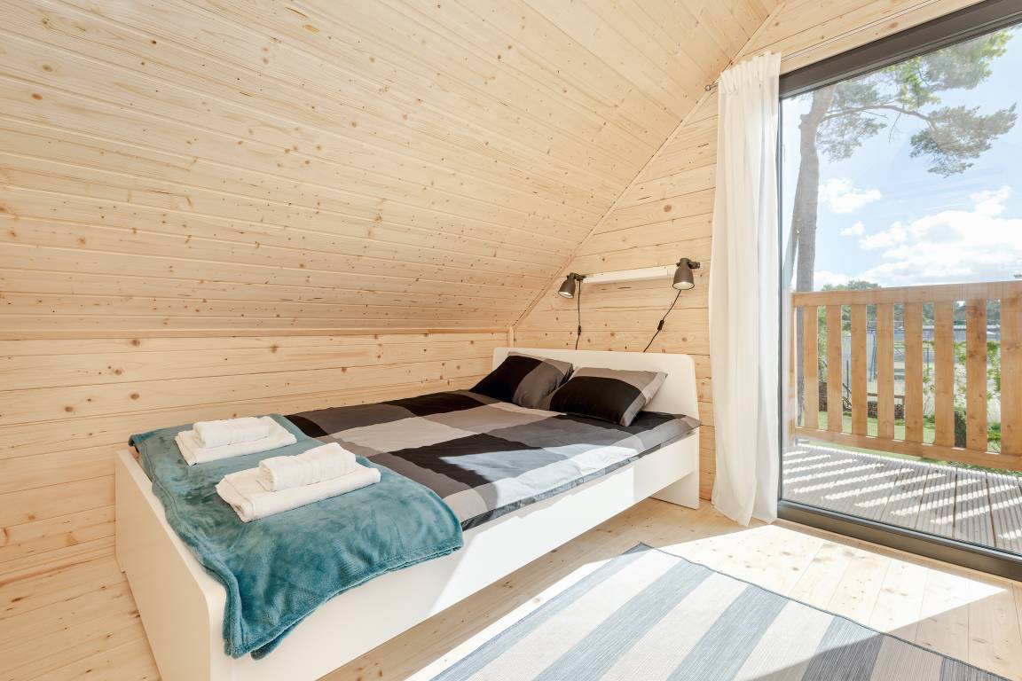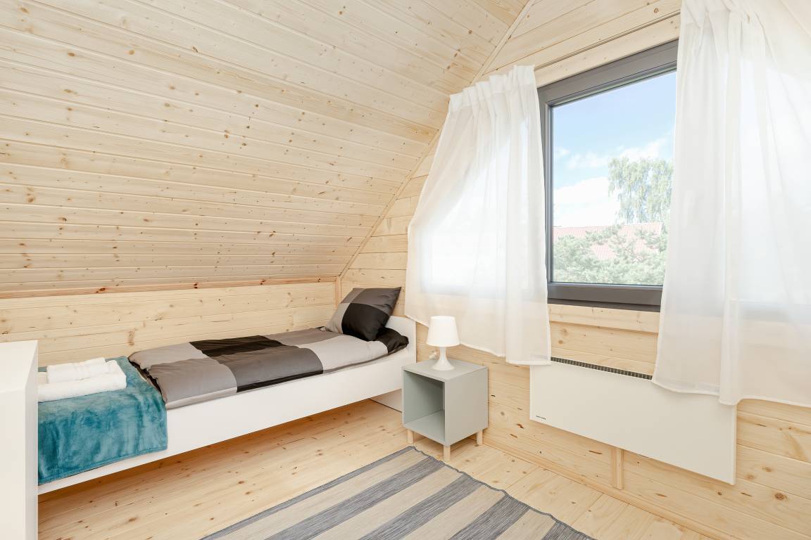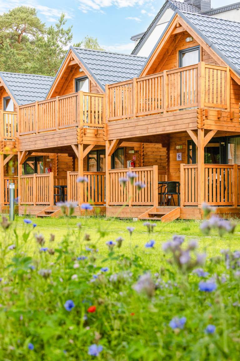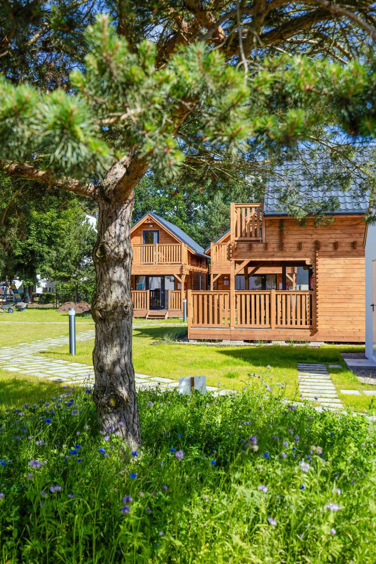 PL 34.19 Ferienhaus 2-6 Pers.: Helles 3-Zimmerhaus mit 57 qm Wohnfläche über 2 Etagen. Parterre: lichtdurchfluteter Wohn-/Essraum mit bodentiefen Fenstern, Couchgarnitur (Schlafsofa für 2 Pers.), Flachbild TV, Internet über W-Lan, Esstisch, gut ausgestattete Küchenzeile (4 Pl. Ceranfeld, Mikrowelle, Dunstabzug, Spülmaschine). Bad/WC. Dachgeschoss: zwei Doppelzimmer, eines davon mit Balkon. Überdachte Terrasse mit Sitzmöbeln und Grill davor Grünfläche.