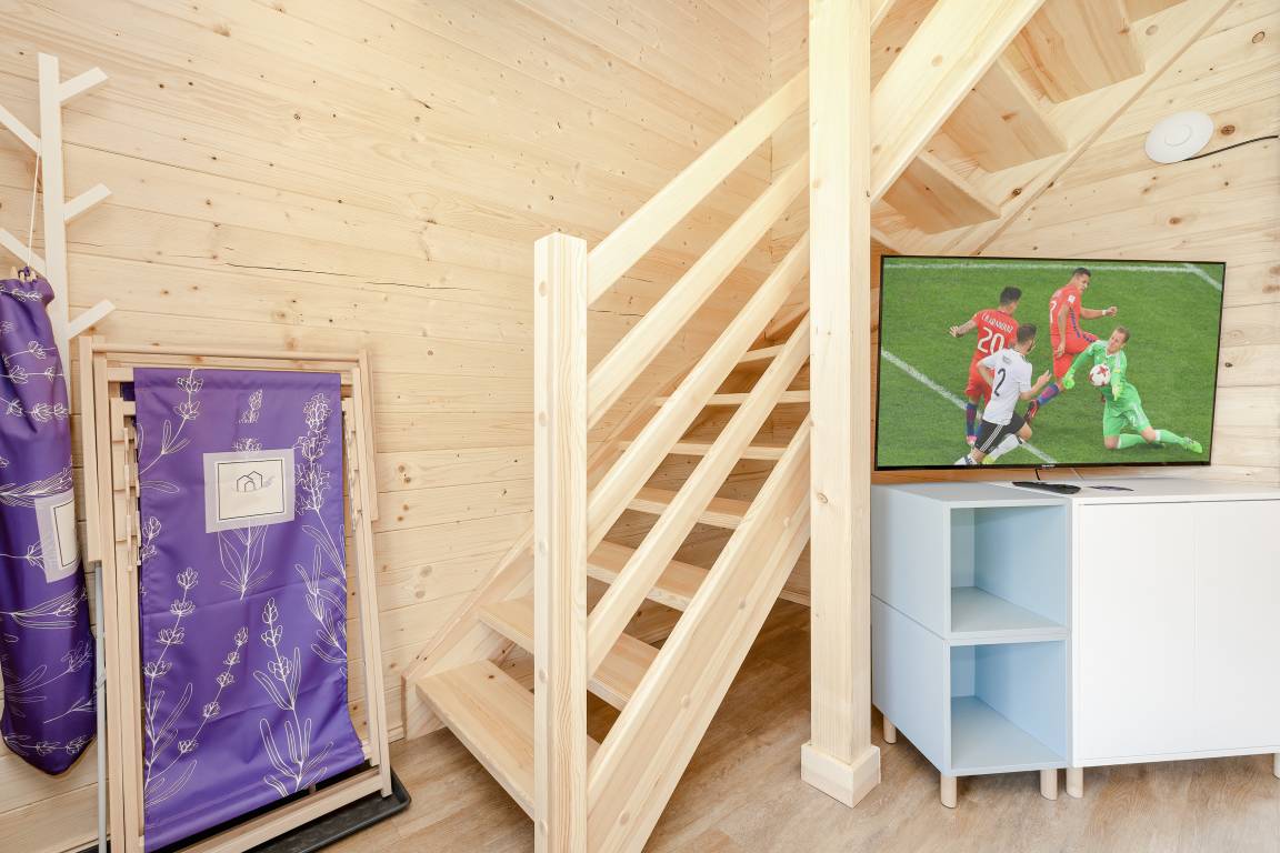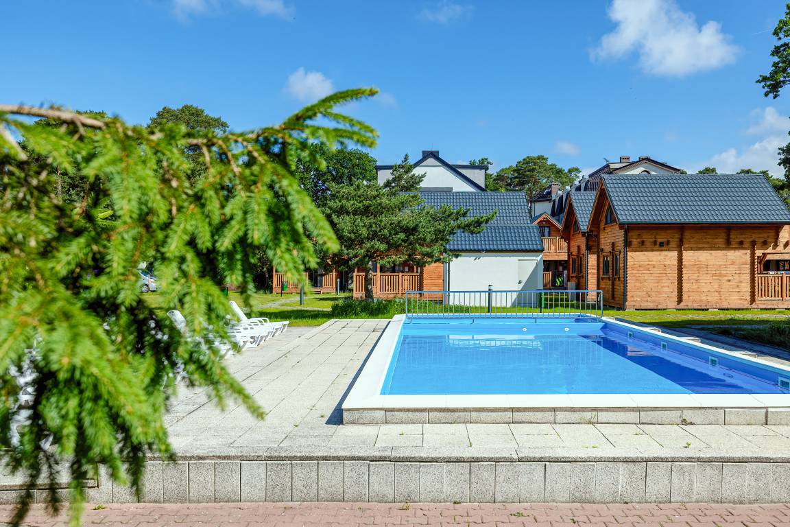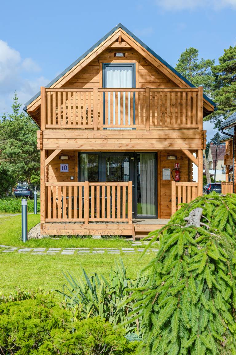 Haus: Schöne Ferienhausanlage mit 11 Ferienhäusern auf einem 2,5 ha großem Rasengrundstück, 2024 neu erbaut. Großzügige Holzhäuser mit moderner Einrichtung. Nichtraucherhaus. Rustikal gemütliches Flair durch Holzbalkendecken. Heizung mit E-Radiatoren, Klimaanlage mit Heizfunktion im Wohn/Essraum. Warmwasser über E-Boiler (65 l.). Balkon. Überdachte Terrasse mit Sitzmöbeln, Grill. 1 Parkplatz/ Ferienhaus auf umzäuntem Grundstück inklusiv.