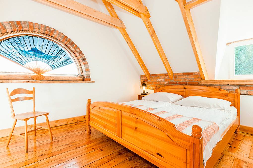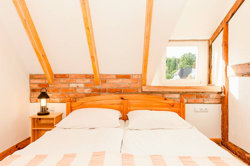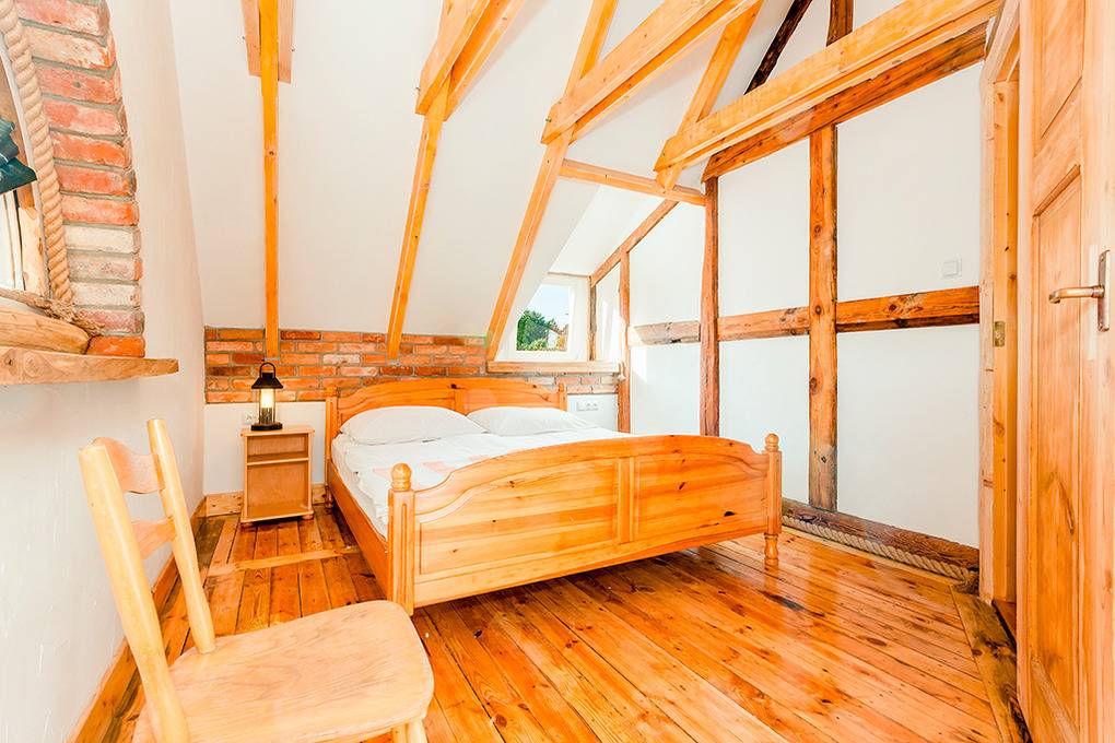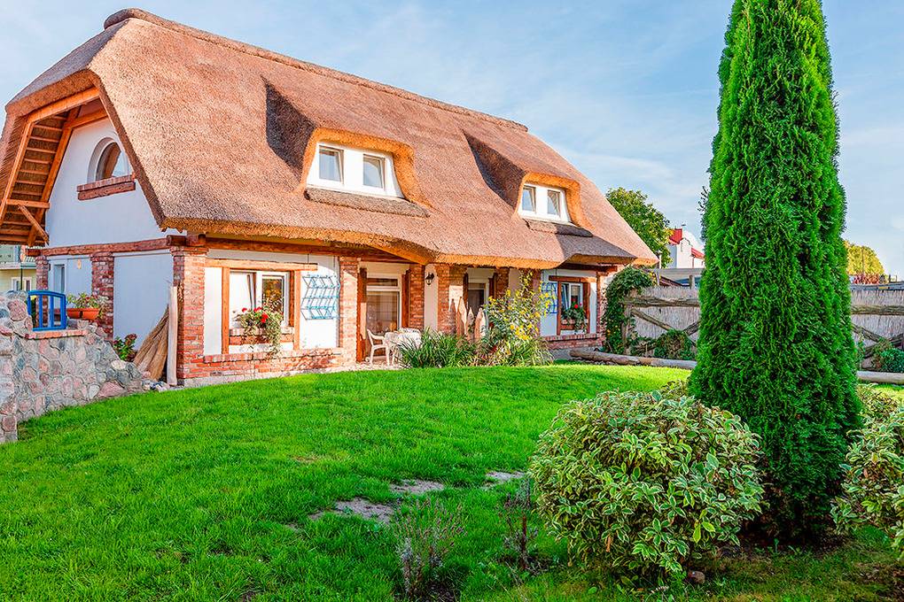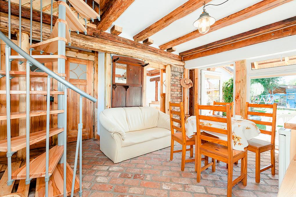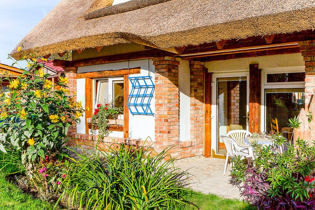 PL 34.3 Ferienhaus 3-8 Pers.: Gemütliche Reetdach-Haushälfte mit 70 qm Wohnfläche über 2 Etagen. Parterre: Rustikaler Wohn-/Essraum mit Holzbalkendecke, Natursteinwand, Kaminofen, Sat-TV (dt. Programme), Esstisch, Küchenzeile (4 E-Platten, Abzugshaube). Schönes Doppelzimmer. Bad: Sauna, Du, Wb. Separates WC. Holzstiege ins rustikal ausgebaute Dachgeschoss: 4-Bettzimmer mit Doppelbett, Sofa (Klappcouch für 2 Pers.). Doppelzimmer. Terrasse mit Sitzmöbeln.