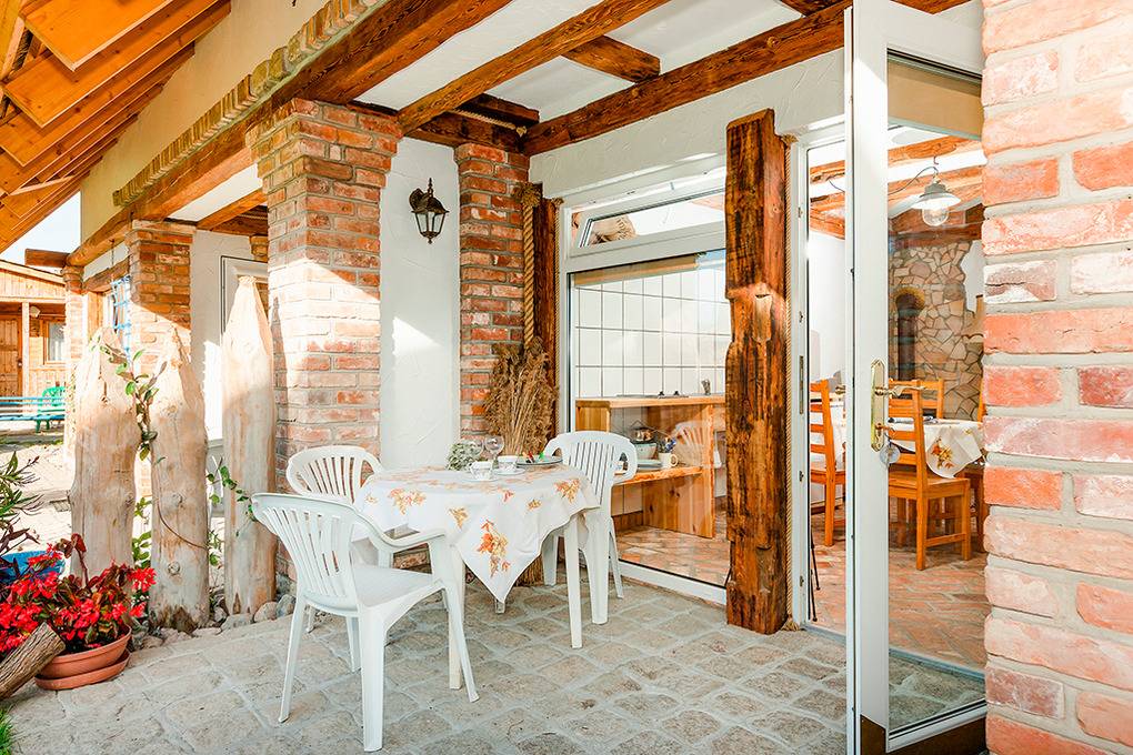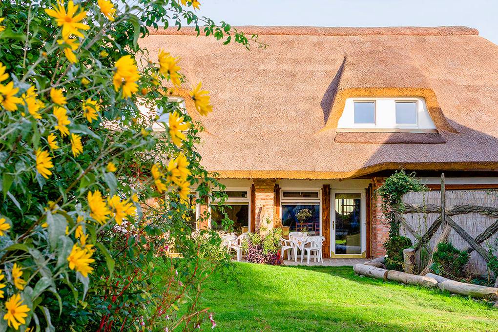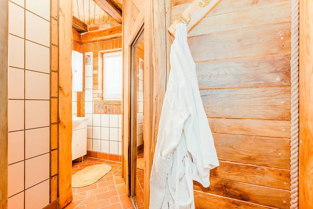 Haus: Zwei schöne Reetdachhäuser mit Sauna und Kaminofen. Rustikale Einrichtung, vom Eigentümer mit Fantasie und Liebe zum Detail eingerichtet. Heizung durch Fußbodenheizung (nur im Badezimmer) und E-Radiatoren (auf Wunsch). Warmwasser über E-Boiler (50 l). Terrasse mit Sitzmöbeln.