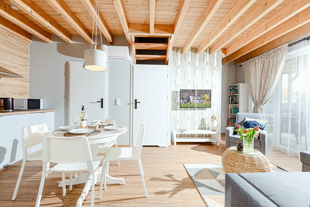 Haus: Gepflegte Ferienhaus-Anlage mit Rezeption. Schöne, moderne Ferienhäuser mit geschmackvoller Einrichtung. Kostenloses Internet (WiFi). Fußbodenheizung, teilweise Klimaanlage. Terrasse mit Sitzmöbeln, Grill. Kinderspielplatz mit Klettergerüst, 2 Rutschen. 1 Pkw-Stellplatz/Haus.
