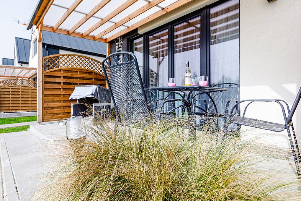 Haus: Gepflegte Ferienhaus-Anlage mit Rezeption. Schöne, moderne Ferienhäuser mit geschmackvoller Einrichtung, E-Kamin. Kostenloses Internet (WiFi). Fußbodenheizung. Terrasse mit Sitzmöbeln, Grill. Kinderspielplatz mit Klettergerüst, 2 Rutschen. 1 Pkw-Stellplatz/Haus.