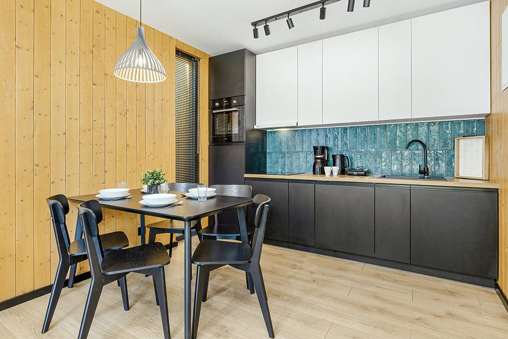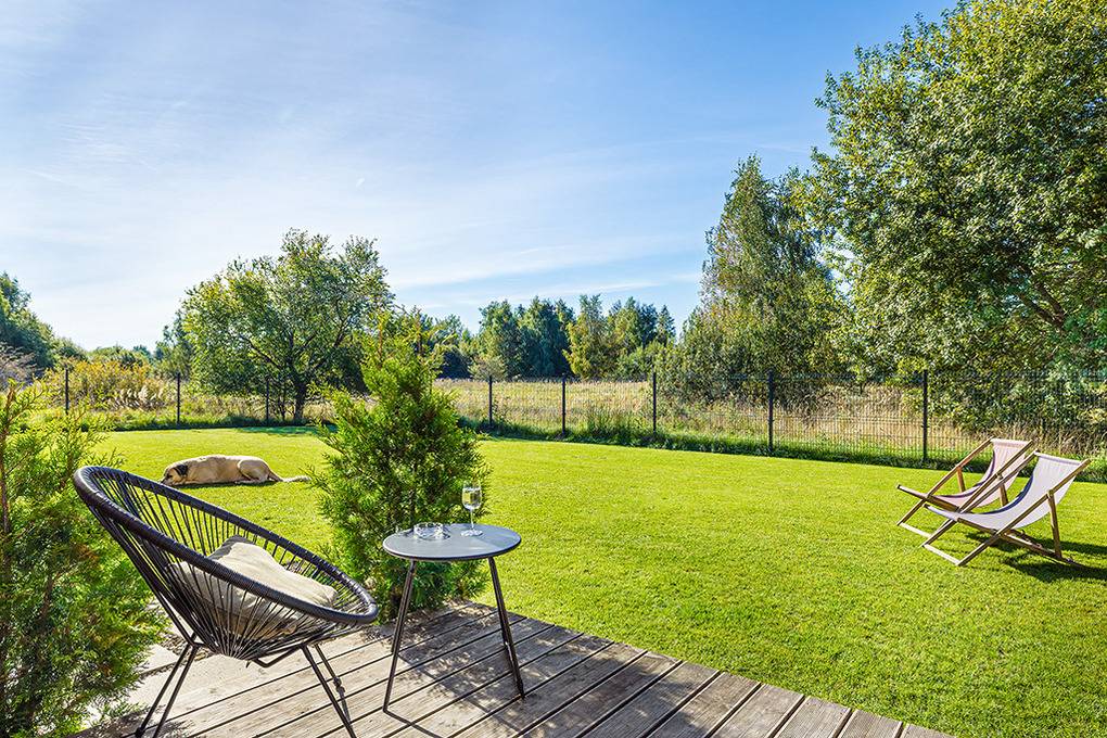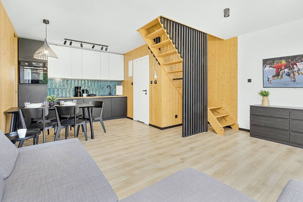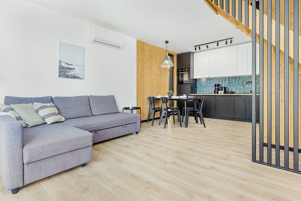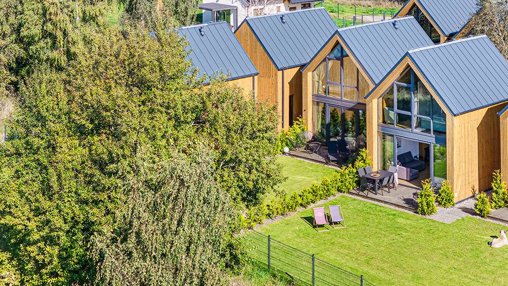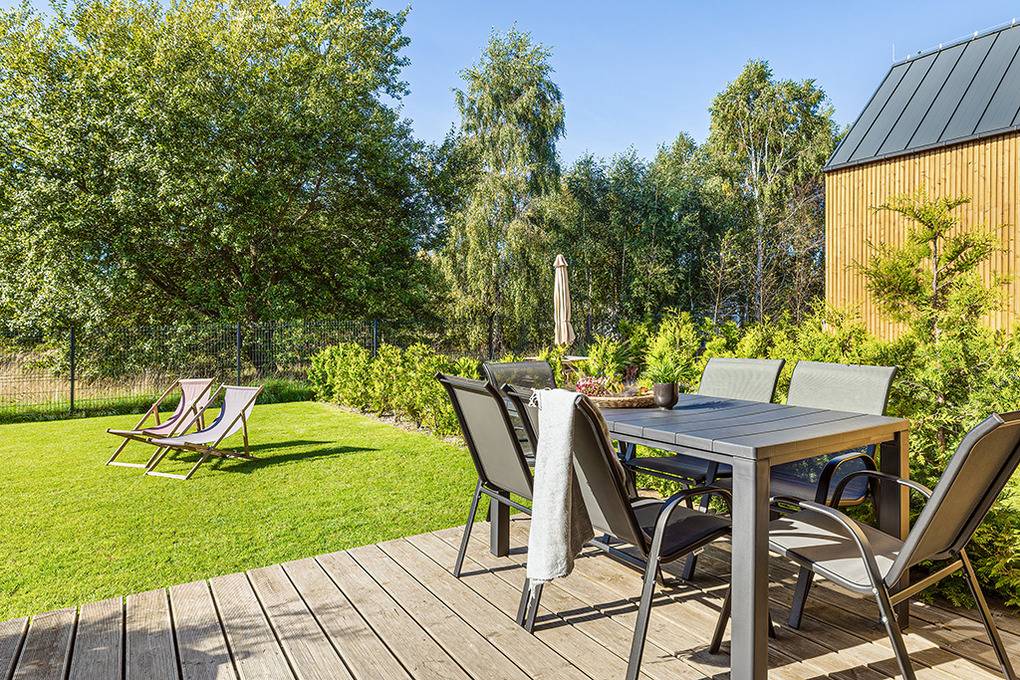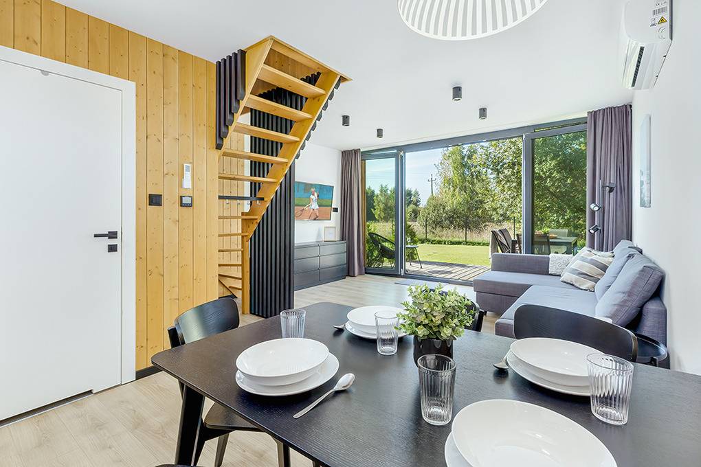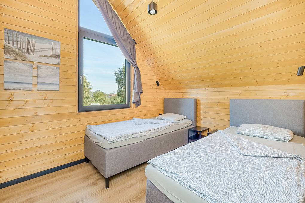 PL 34.10 Ferienhaus 2-6 Pers.: 3-Zimmer-Ferienhaus mit 60 qm Wohnfläche über 2 Etagen. Parterre: Wohn-/Essraum mit Couchgarnitur (Ausziehcouch 2 Pers.), Flachbild Sat-TV (deutsche Programme), großem Esstisch, Küchenzeile (Induktionsherd 4 Platten, Mikrowelle, Spülmaschine). Modernes Bad mit Dusche, Wb, WC. 1. Etage: Doppelzimmer mit herrlichem Blick in den Garten. 2-Bettzimmer. Kleines Bad mit Wb, WC.