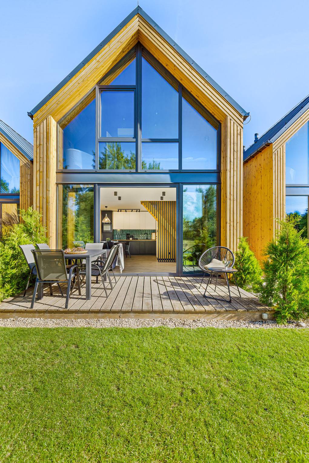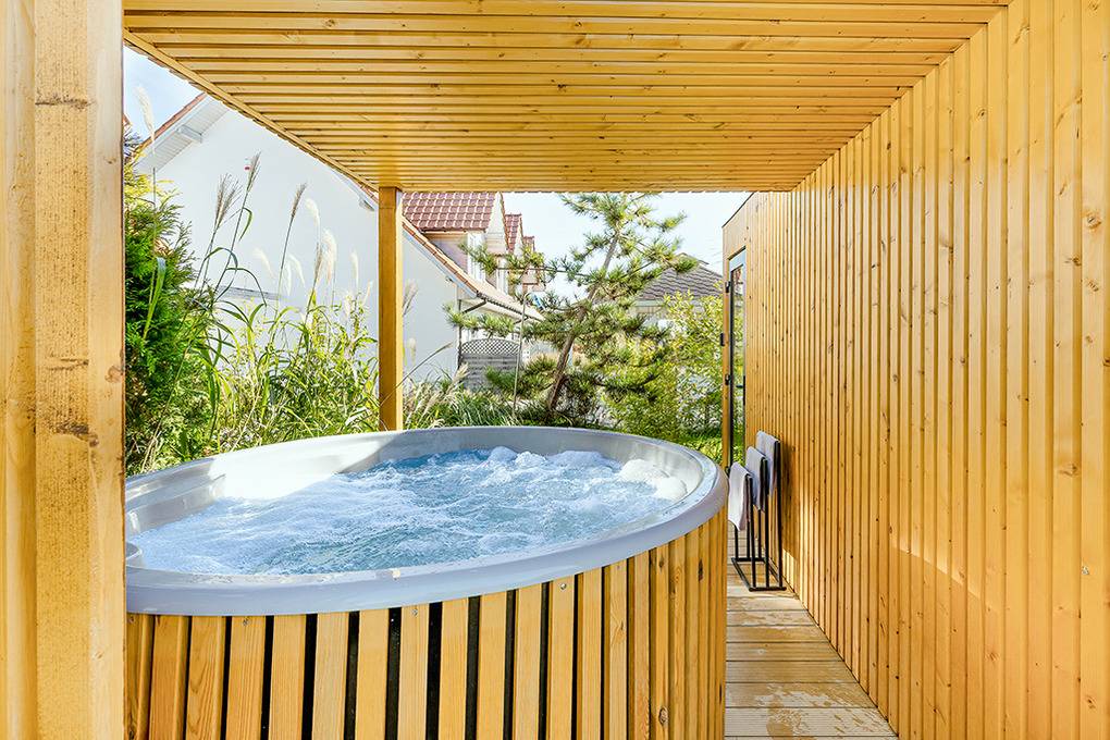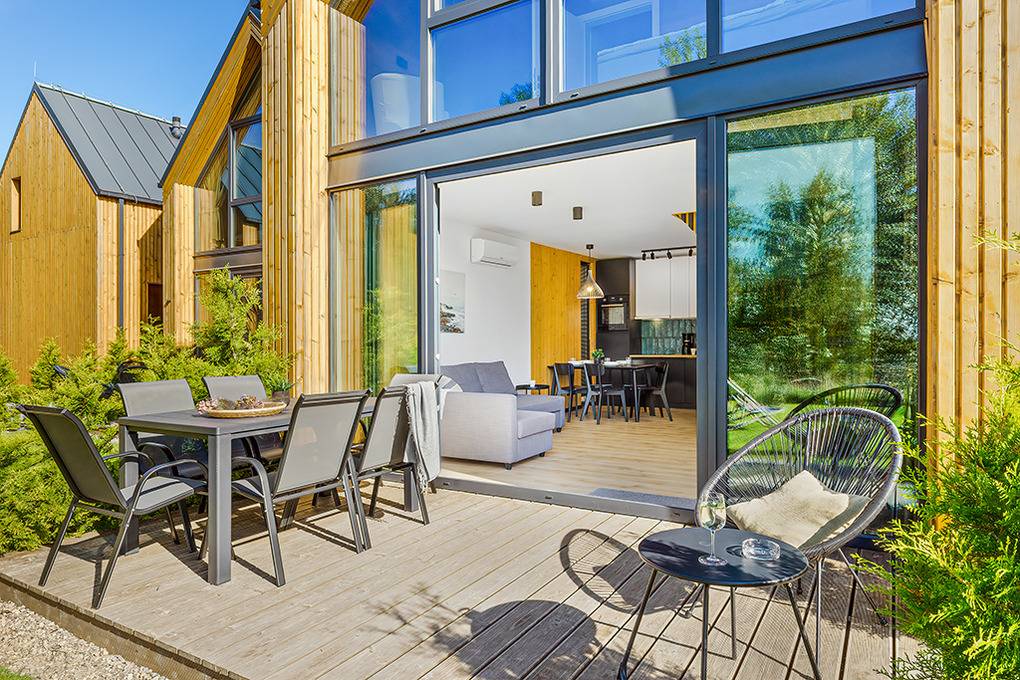 Haus: Schönes, architektonisch ansprechendes Ferienhaus mit Glasfront in einer kleinen Ferienhausanlage, 2024 neu erbaut. Nichtraucherhaus. Moderne, geschmackvolle Einrichtung. Heizung durch Klimaanlage (Kühl- und Heizfunktion). Kostenloses Internet über W-Lan. Großzügige Terrasse mit Sitzmöbeln. Schöne Sauna, Tauchbecken und Grillplatz zur Gemeinschaftsnutzung im Garten. Schöner Spielplatz für Kinder. 1 Pkw-Stellplatz/Haus vor dem Grundstück. Eine Waschmaschine in der Anlage zur gemeinschaftlichen Nutzung.