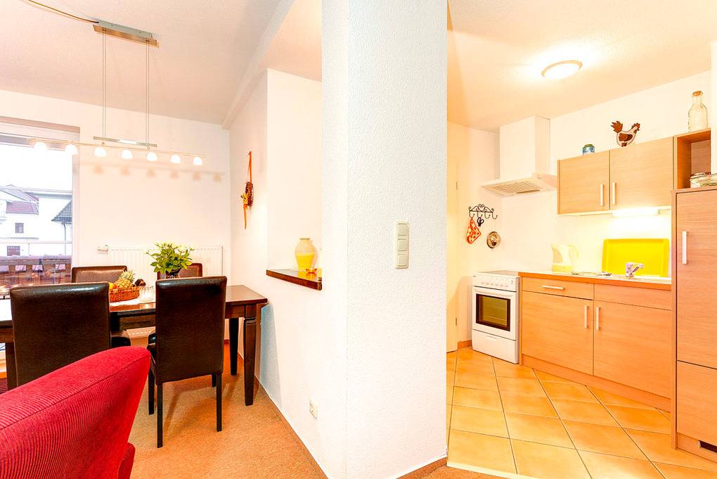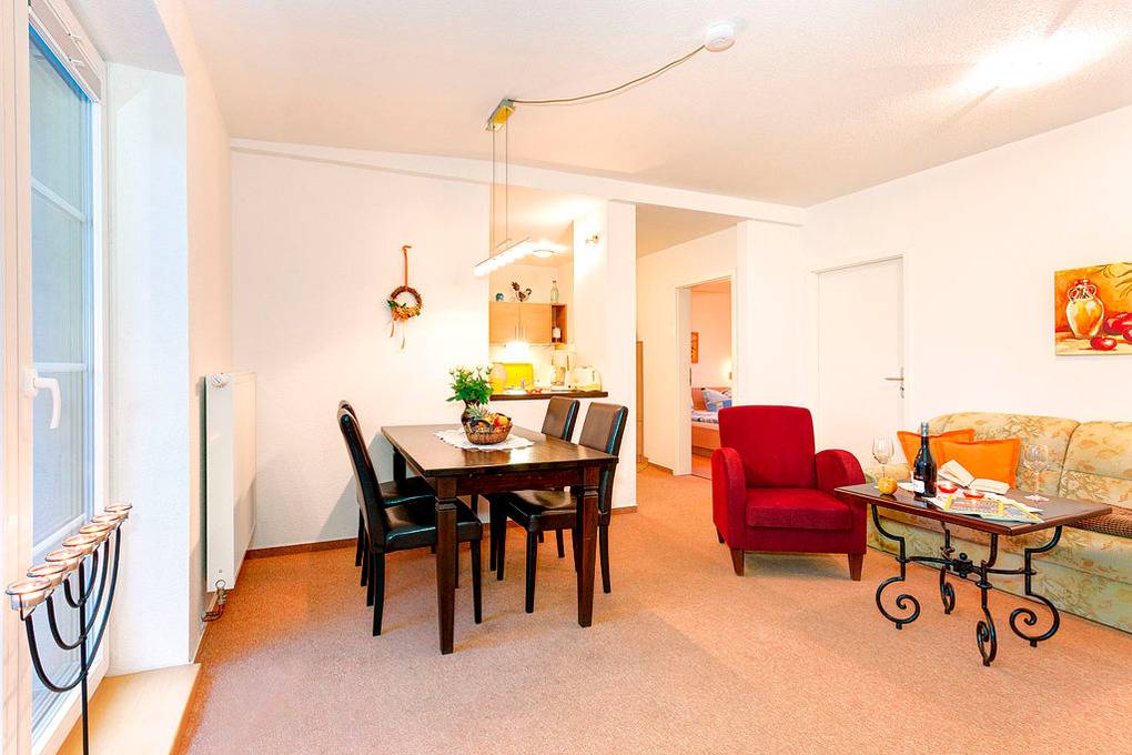 D 129.748 Wohnung 2-3 Pers.: 2-Zimmerwohnung mit 45 qm Wohnfläche, Parterre. Wohn-/Essraum mit Couchgarnitur (Ausziehcouch 1 Pers.), Flachbild-Sat-TV, Esstisch, moderner Küchenzeile (Backofen). Doppelzimmer. Bad/WC.
