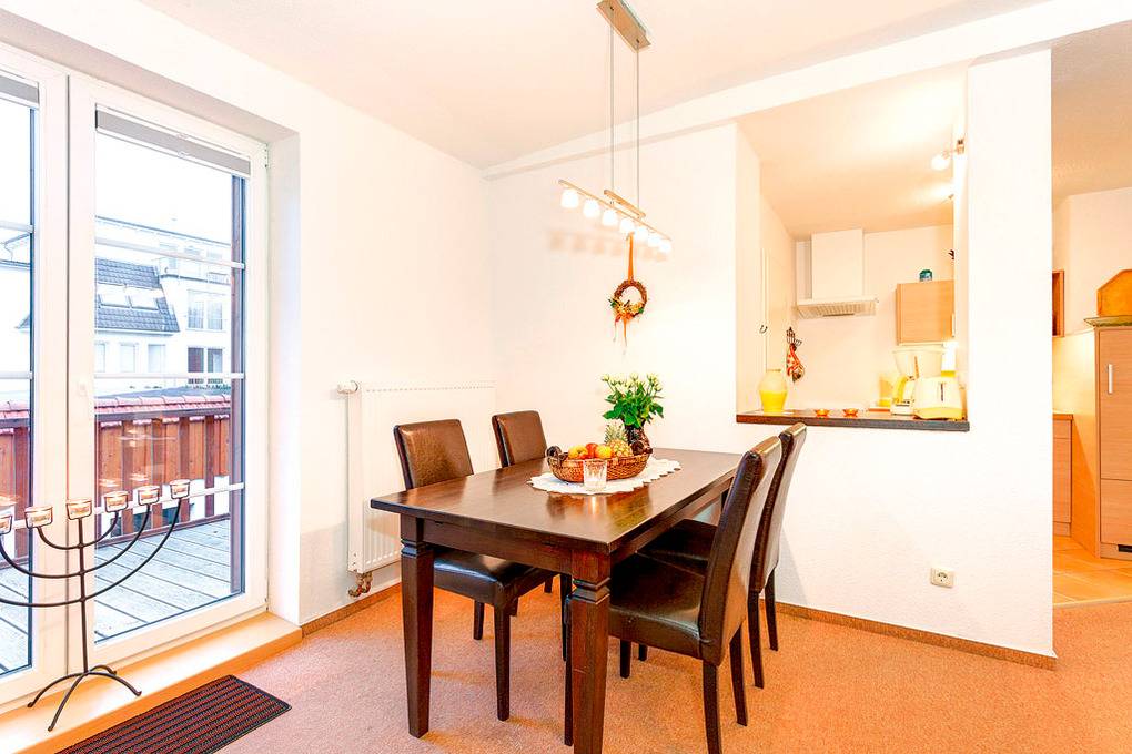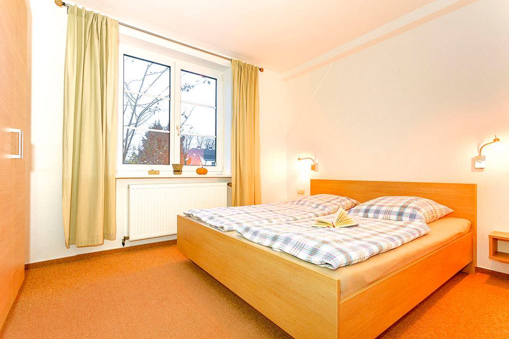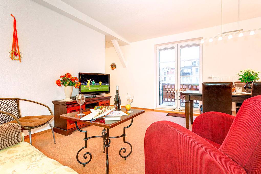D 129.742 Wohnung 2-4 Pers.: 3-Zimmerwohnung mit 65 qm Wohnfläche, 1. Etage. Wohn-/Essraum mit Couchgarnitur, Sat-TV, Esstisch, kleiner Küchenzeile (Backofen). 2 Doppelzimmer. Bad/WC. Balkon mit Strandkorb.