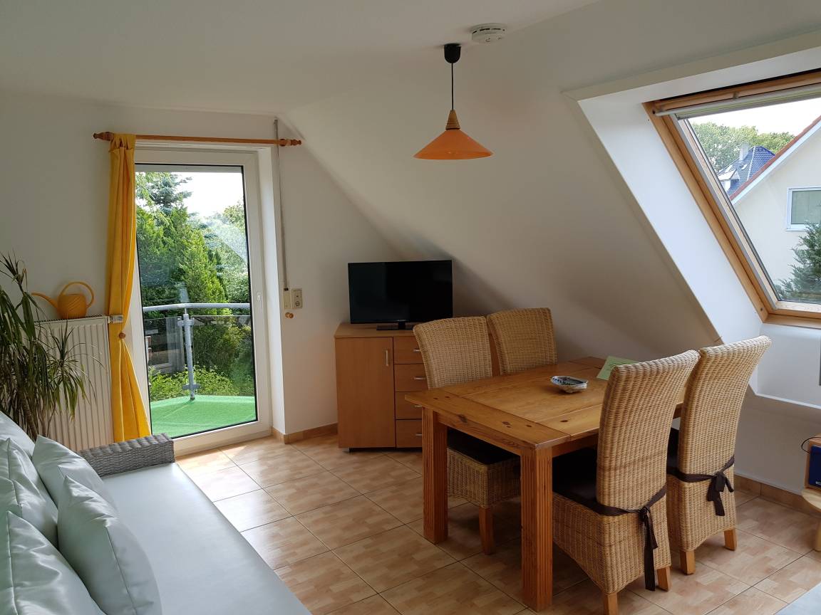 Die Ferienwohnung Bornholm ist für 1-5 Personen und liegt im Obergeschoss des Ferienhauses. Sie verfügt über zwei Schlafzimmer und ein Wohnzimmer mit Schlafcouch, einer Single-Küche sowie einem Balkon. Außerdem gibt es ein großzügiges Badezimmer.