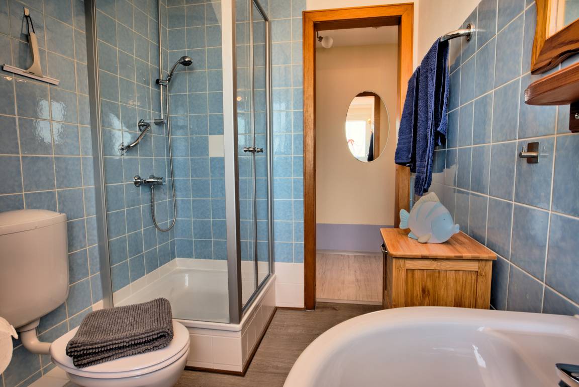 Die im 1. Stock gelegene, liebevoll eingerichtete Wohnung bietet auf 55 qm ein behagliches Wohn- Esszimmer, ein separates Schlafzimmer, eine separate Küche, ein Bad mit Dusche und WC und einen kleinen, nach Süd-/Ost ausgerichteten Balkon. Zusätzlich zur gemütlichen Sitzgarnitur gibt es noch einen elektrisch verstellbaren Sessel, der wunderbar zum Lesen oder relaxen einlädt. Der Essplatz bietet mit einem ausziehbaren Tisch und vier Stühlen hinreichend Platz. Die sehr gut ausgestattete Küche lässt kaum Wünsche offen. Im Schlafzimmer sorgt ein Kleiderschrank und eine Kommode für Ordnung und im 1,80m x 2,00 m großen Bett mit Bettwäsche in Übergröße lässt es sich herrlich träumen. Das helle Tageslichtbad ist ausgestattet mit Dusche, WC und Waschbecken.