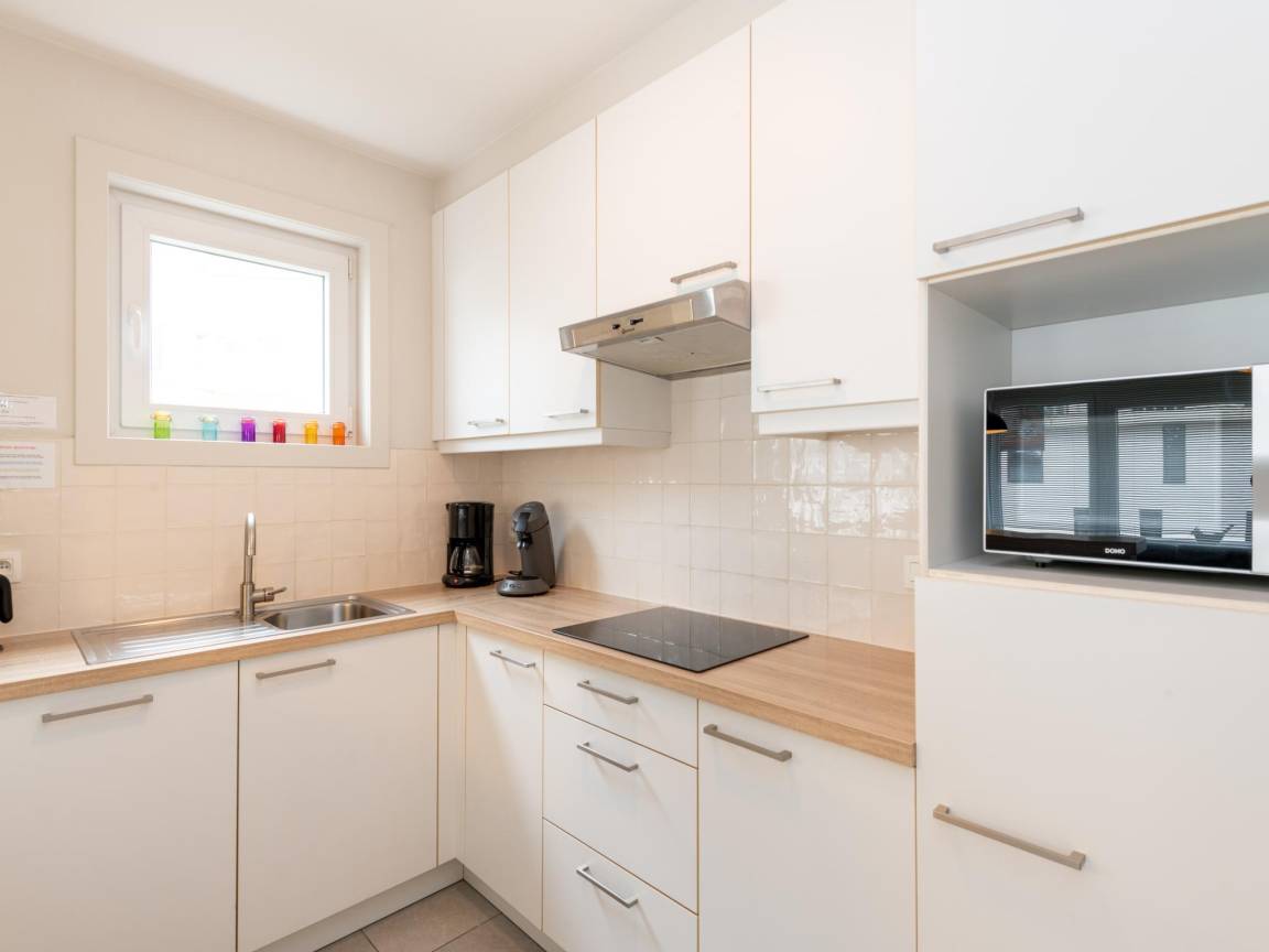 Layout : In der 2. Etage: offene Küche mit Kochplatte, Wasserkocher, Dunstabzugshaube, Kaffeemaschine(Filter, senseo pads), Backofen, Mikrowelle, Geschirrspüler , Wohn/Esszimmer mit TV(Flatscreen, digital, smart TV), Esstisch, Sitzecke, 1x Hochstuhl , 2x Schlafzimmer mit Doppelbett , Schlafzimmer mit Etagenbett , Badezimmer mit Dusche(ebenerdige Dusche), Waschbecken, Föhn , Toilette mit Toilette , 1x Kinderbett (ohne Bettwäsche)