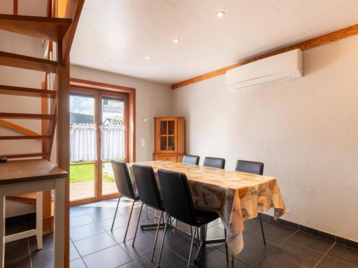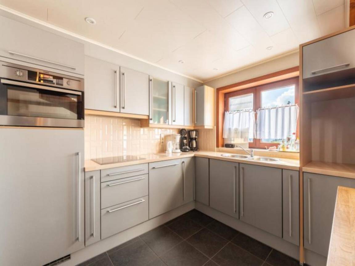 Layout : Parterre: offene Küche mit Kochplatte, Wasserkocher, Dunstabzugshaube, Kaffeemaschine(Filter, senseo pads), Backofen, Mikrowelle, Kühlschrank(+ Gefrierfach) , Wohn/Esszimmer mit TV(Flatscreen, digital), Esstisch, Sitzecke , Schlafzimmer mit Doppelbett(Doppelbettdecke, 160 x 200 cm) , Badezimmer mit Massagedusche, Waschbecken, Föhn , Toilette mit Toilette