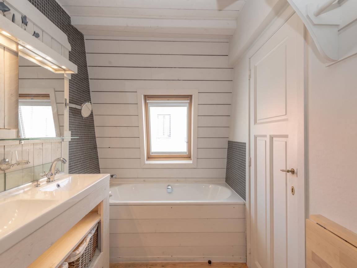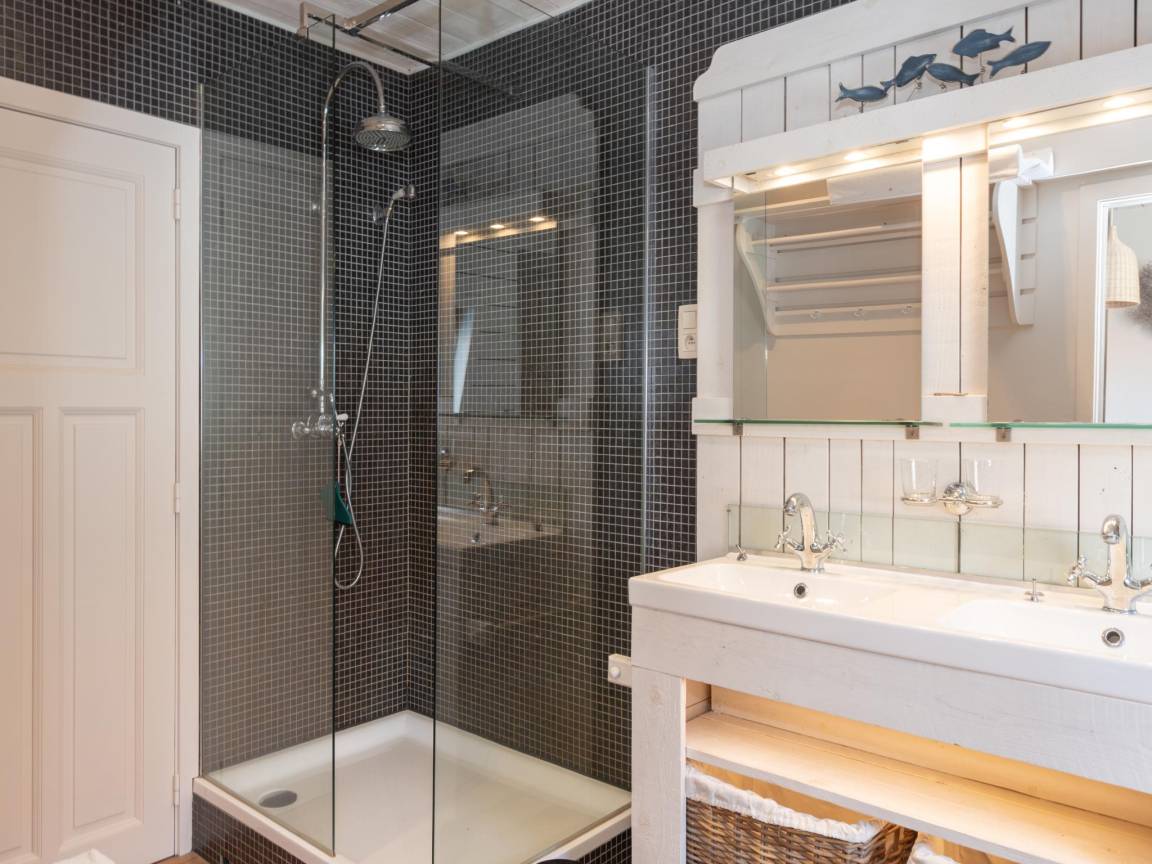 In der 1. Etage: Schlafzimmer mit Doppelbett(Doppelbettdecke, 160 x 200 cm), 1x Kinderbett (ohne Bettwäsche) , Durchgangsschlafzimmer mit 2x Einzelbett(Bettdecke, 90 x 200 cm) , Badezimmer mit Badewanne, Dusche(ebenerdige Dusche), 2x Waschbecken, Föhn