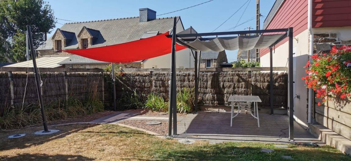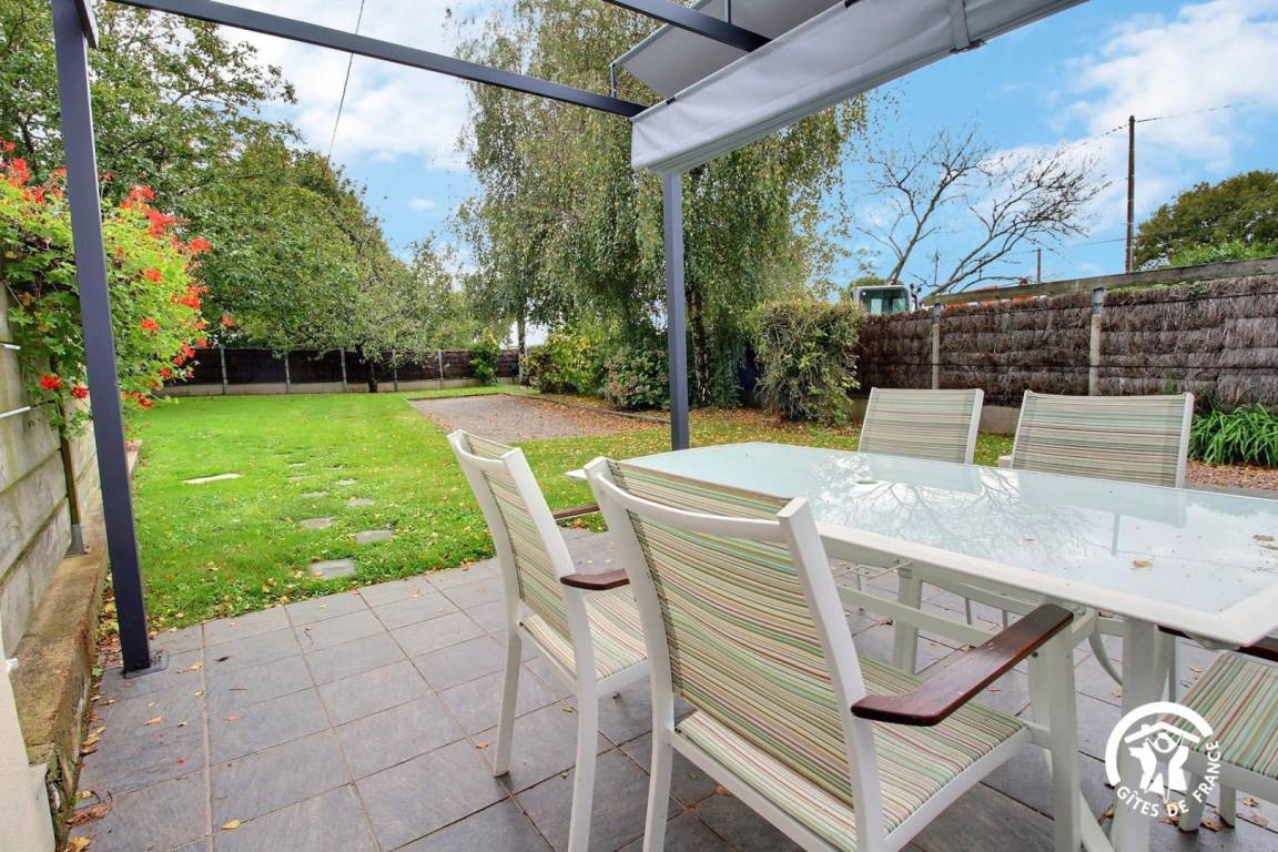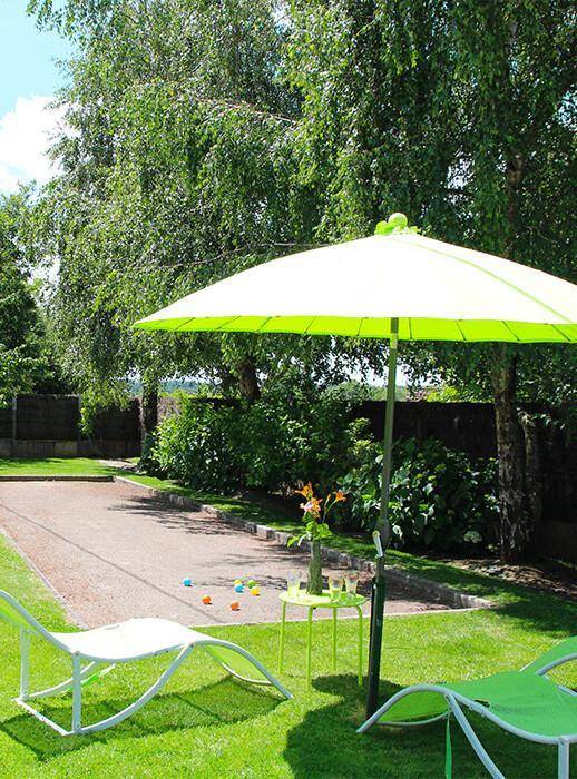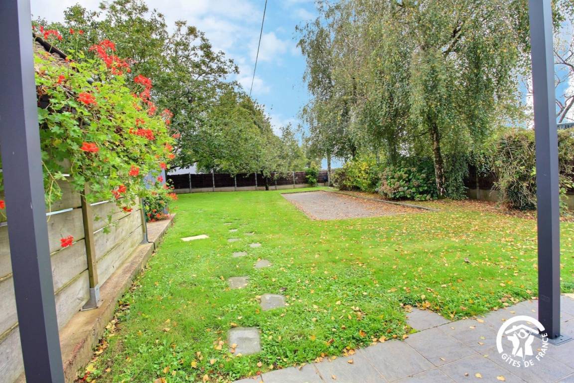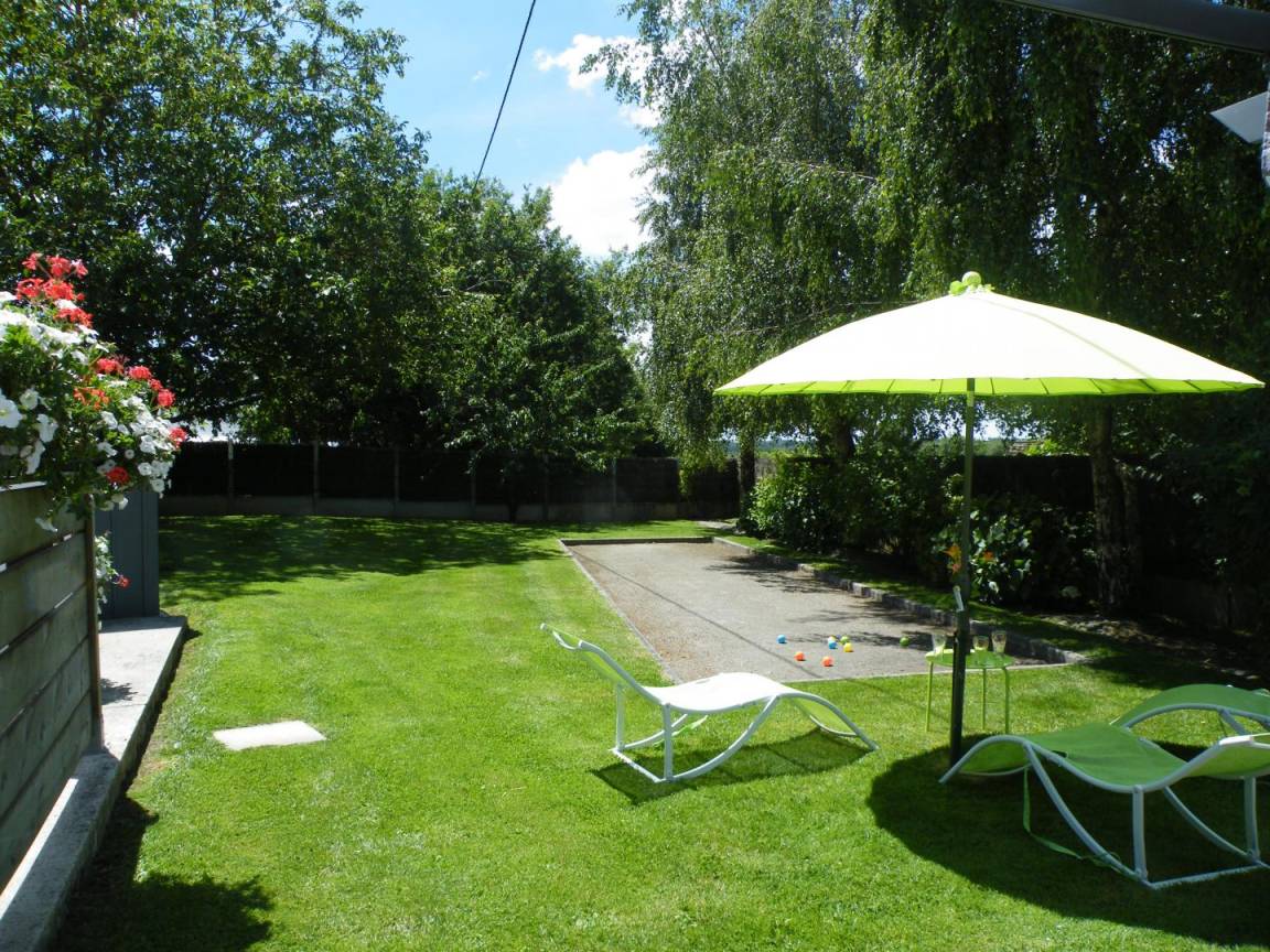 Draußen: ein 500 m² großer, umzäunter Garten mit Bouleplatz und Terrasse mit Gartenmöbeln und Grill.