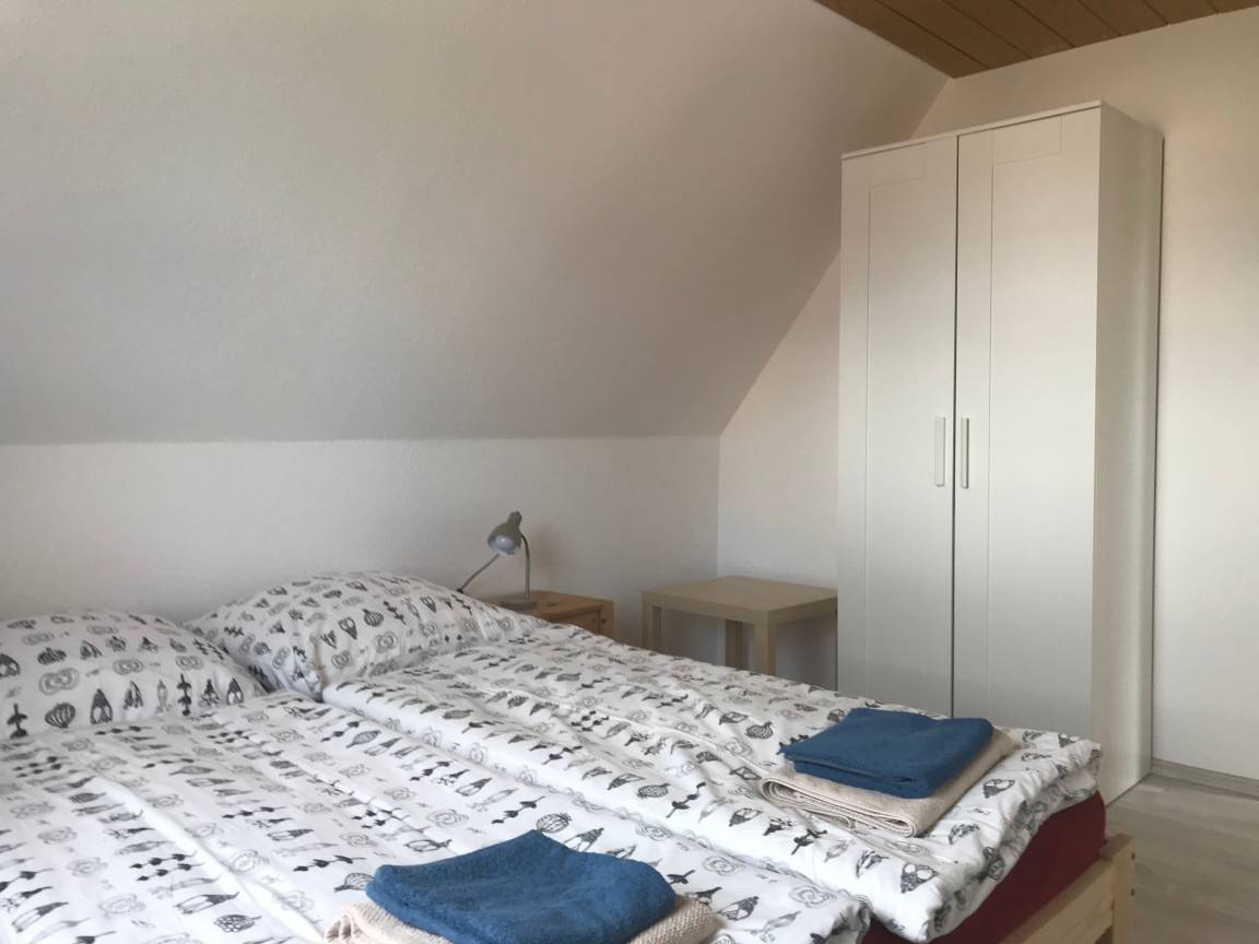 Die sich im Obergeschoss eines Einfamilienhauses befindliche Ferienwohnung liegt in einer ruhigen Sackgasse am Rande des Dorfes und ist über eine schmale Treppe erreichbar und daher für gehbehinderte Gäste nur begrenzt geeignet. Auf 65 qm bietet die Wohnung zwei Schlafzimmer mit zwei Einzelbetten und einem Doppelbett, eine sehr gut eingerichtete Küche mit Esstisch, Toilette mit Dusche sowie ein gemütliches Wohnzimmer mit Kaminofen.