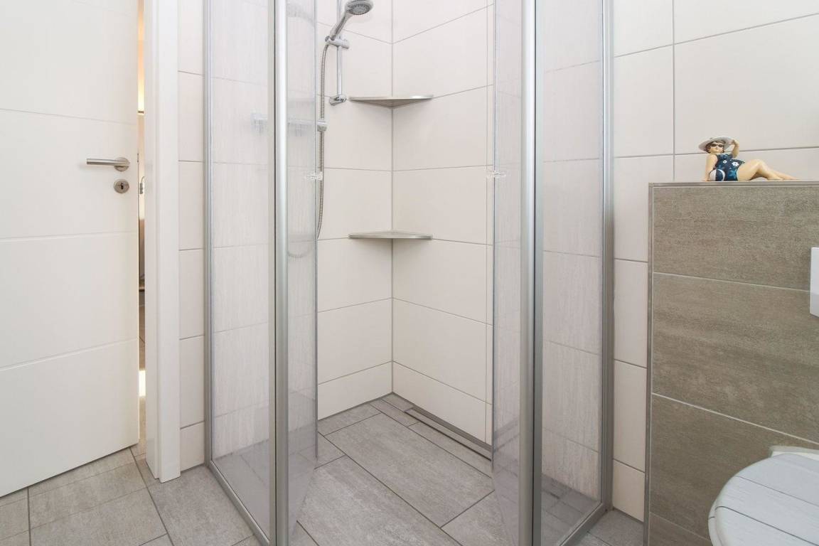 Das Tageslichtbad bietet eine bodentiefe Dusche samt WC, Waschbecken und Handtucherwärmung.