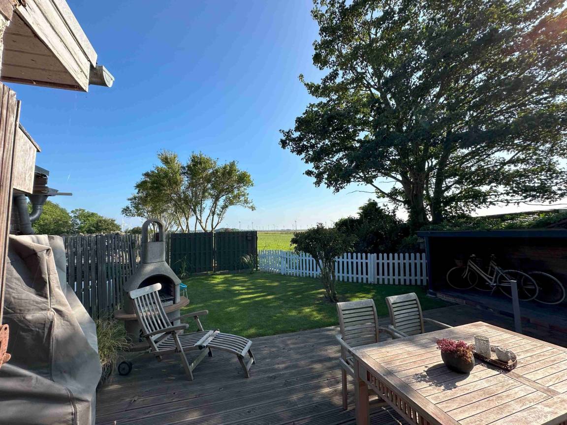 Ferienhaus "Huus an't Diek" in Norden/Ostermarsch . Bei dem Ferienhaus handelt sich um eine Doppelhaushälfte über zwei Etagen mit Garten, Parkplatz, Wohn und Schlafzimmer, eine voll ausgestatte Küche, Holzterrasse, Strandkorb , Gartenmöbel und Grill.