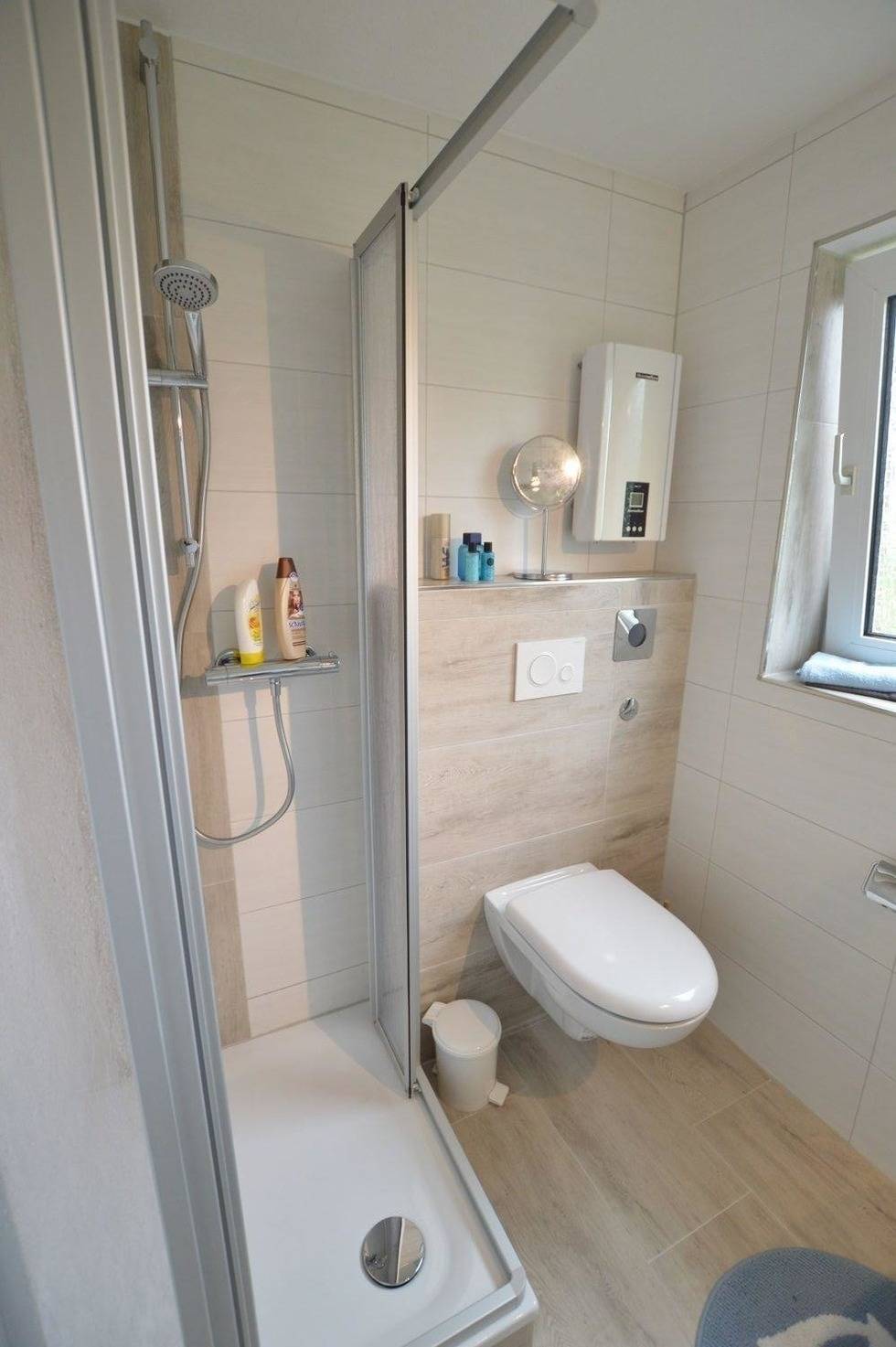 Das renovierte Tageslichtbad im Obergeschoss warten mit einer Dusche mit niedrigen Einstieg, Waschbecken, WC und Handtuchheizung auf Sie.