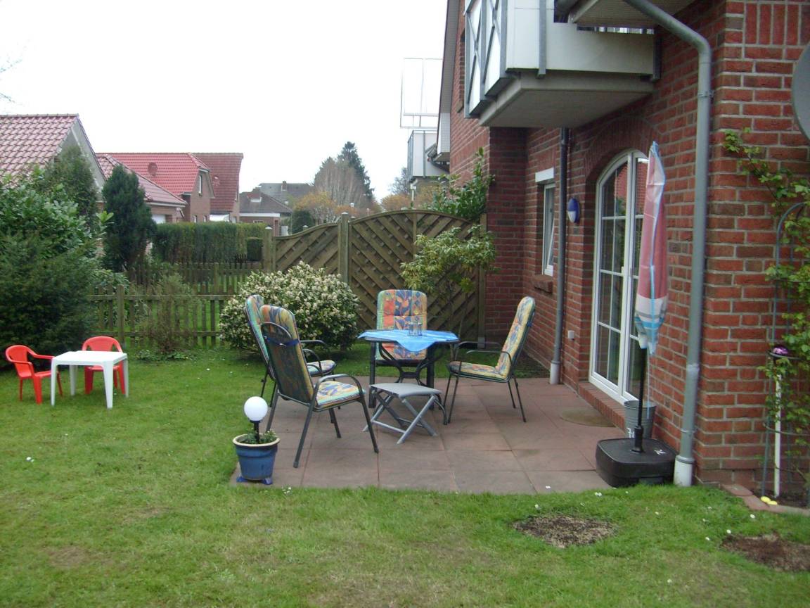 Die große, sonnige Terrasse ist gepflastert und vom Wohnzimmer aus erreichbar. Von dort aus grenzt eine große Wiese an, die um eine Ecke des Hauses herum geht, so dass man viel Platz zum Sonnenbaden hat. Das Haus mit angrenzendem Rasen, ist nach Süd/West ausgerichtet. Sitzgarnitur mit Sonnenschirm ist vorhanden. Auf dem Grundstück befindet sich eine Gartenhütte zum Abstellen von Fahrrädern und Koffern. Die Wohnung liegt im hinteren Bereich des Hauses, von der Straße am weitesten entfernt.