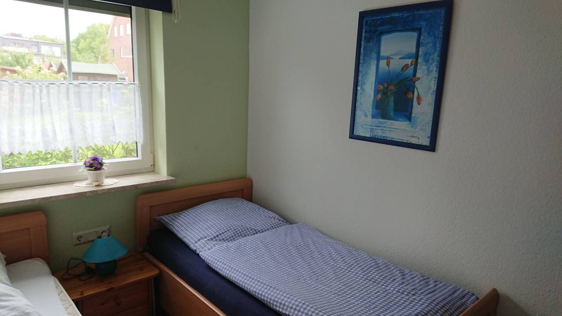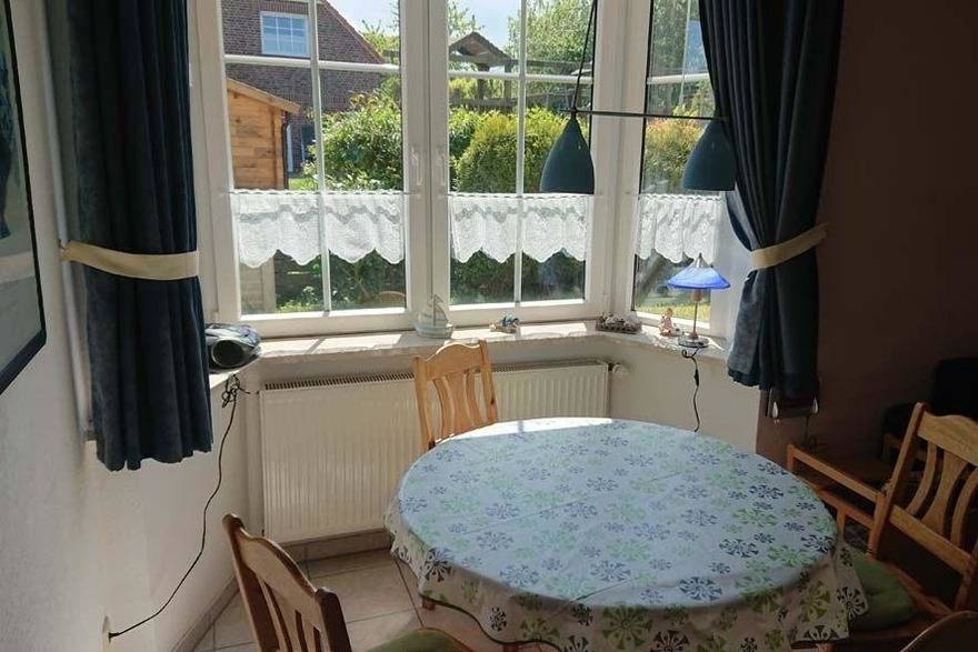 Die Ferienwohnung "Nordseeradler" ist eine ca. 60 m² große Erdgeschosswohnung, hat 2 getrennte Schlafzimmer mit 4 Betten (2 Seniorenbetten und ein Doppelbett 140x190). In einem der beiden Schlafzimmer ist ein zweiter Fernseher untergebracht. Das Duschbad ist mit WC, Waschbecken, Spiegel und Waschmaschine ausgestattet. Komplett eingerichtete Küche inkl. Mikrowelle, Toaster, Kaffeemaschine, Geschirrspülmaschine, usw. Die Essecke befindet sich im Erker (Tisch mit 4 Stühlen). Das Wohnzimmer ist ausgestattet mit einem Sofa, Sessel, Fernseher und Stereoanlage. Ein Internetzugang ist vorhanden.