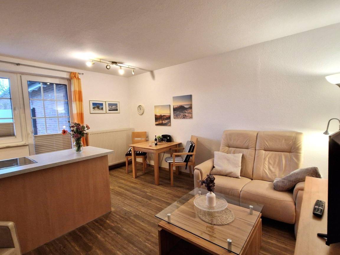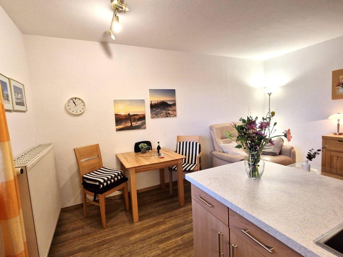 Die strandnahe Ferienwohnung im Erdgeschoss bietet Platz für bis zu 2 Personen und ist vollständig ebenerdig, wodurch sie auch für Menschen mit Gehbehinderungen geeignet ist. Der Wohn- und Essbereich lädt zum Entspannen ein und ist mit einer gut ausgestatteten Küchenzeile versehen. Ein separates Schlafzimmer mit einem komfortablen Doppelbett sorgt für erholsame Nächte. Die Wohnung verfügt zudem über ein Duschbad mit hohem Einstieg.