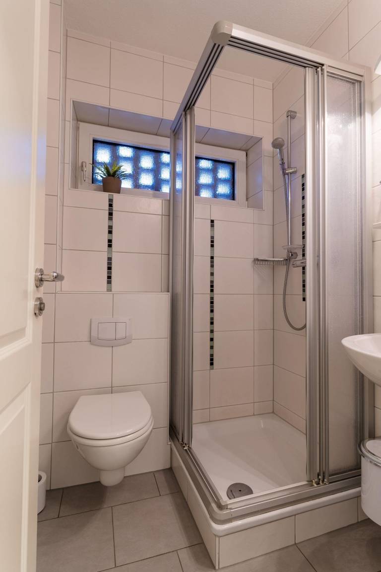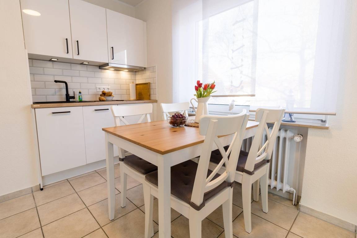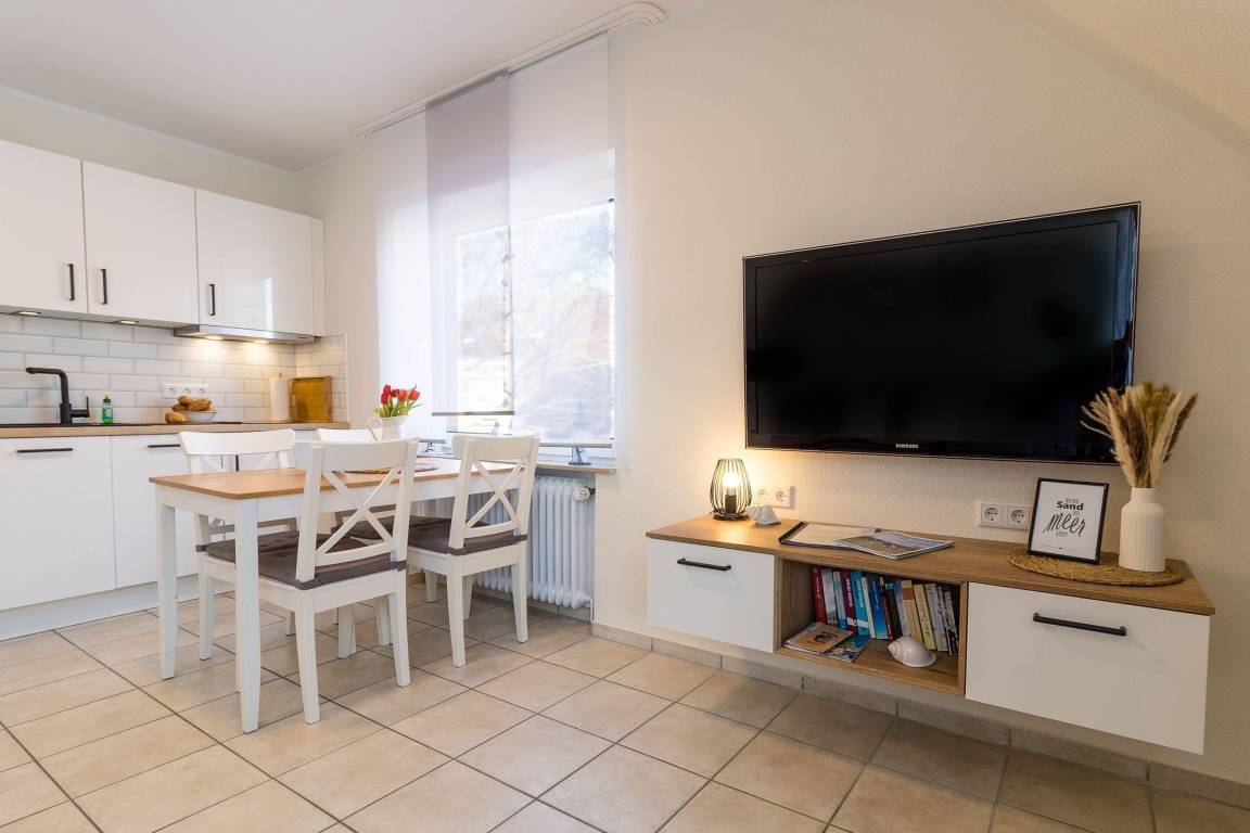 Die Ferienwohnung „Strandkiste" bietet auf ca. 37 m² Platz für bis zu 4 Personen und überzeugt durch moderne Ausstattung und eine ruhige Lage in Norddeich. Der großzügige Wohnraum integriert einen Koch- und Essbereich sowie eine 2-sitzige Couch, die sich in ein 160 x 200 cm großes Doppelbett verwandeln lässt. Die 2025 neu gestaltete Küche ist mit Herd, Backofen, Kühlschrank mit Gefrierfach, Mikrowelle und Geschirrspüler ausgestattet und bietet alles Notwendige für selbständige Mahlzeiten. Im separaten Schlafzimmer steht ein 180 x 200 cm großes Doppelbett und ein TV-Gerät zur Verfügung. Das Badezimmer verfügt über eine Dusche und WC. Die gesamte Wohnung ist mit Fliesen ausgelegt, und kostenfreies WLAN ist verfügbar. Ein Stellplatz sowie ein Gemeinschaftsabstellraum für Fahrräder sind ebenfalls vorhanden. Hunde sind auf Anfrage willkommen, Bettwäsche und Handtücher können kostenpflichtig hinzugebucht werden.