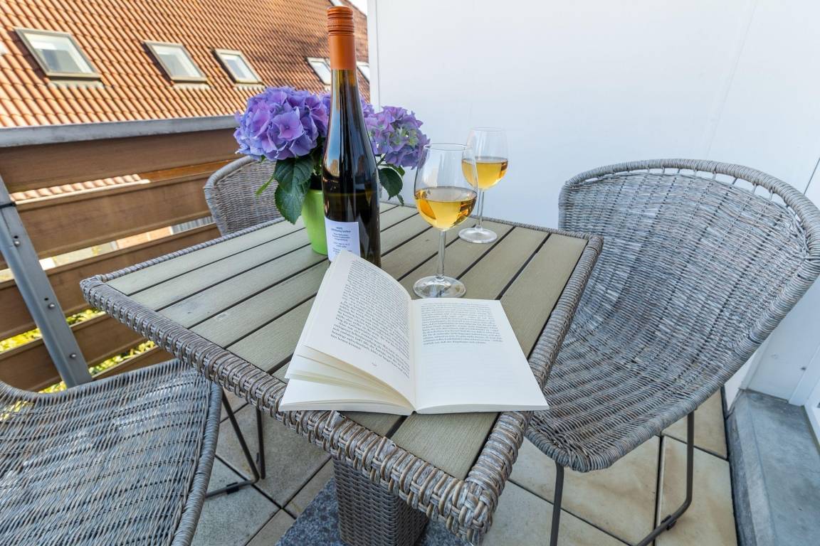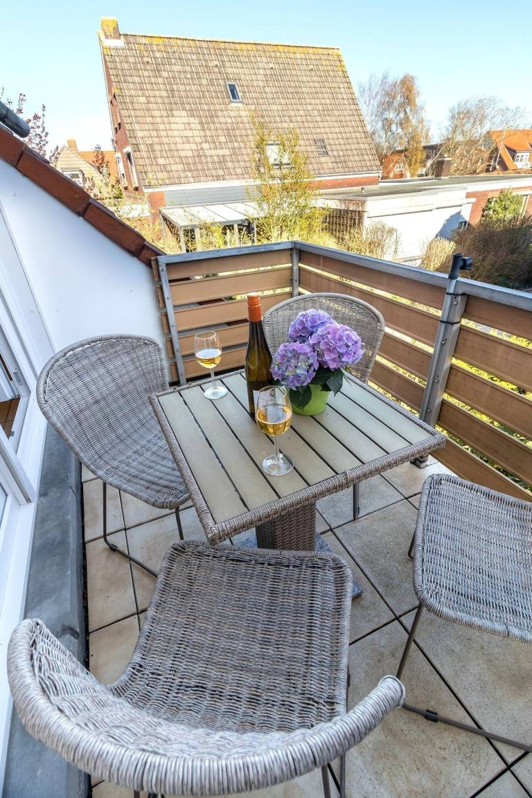 Die Ferienwohnung „Strandkiste" in Norddeich bietet einen einladenden Außenbereich mit einem gemütlichen Süd-Balkon, der mit bequemen Gartenmöbeln ausgestattet ist. Hier können Gäste ihr Frühstück in der Sonne genießen oder an warmen Sommerabenden entspannen. Der Balkon ist ideal für entspannte Stunden im Freien.