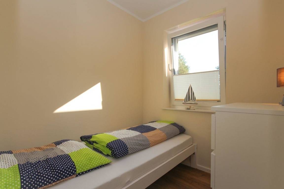 Das kleine Schlafzimmer bietet ein Einzelbett und eine Kommode.