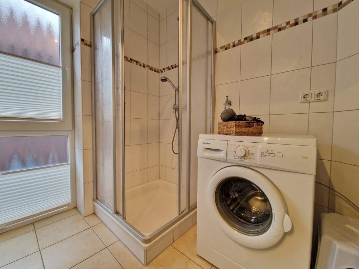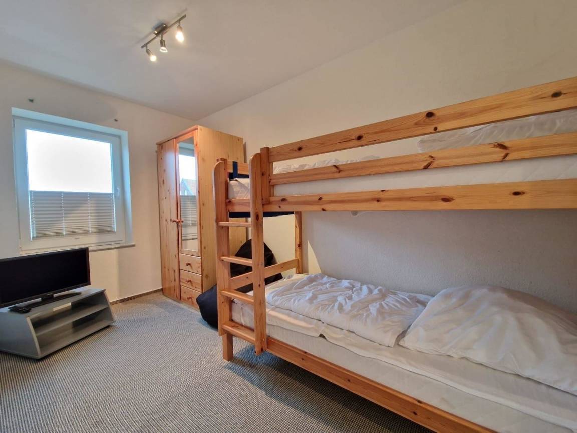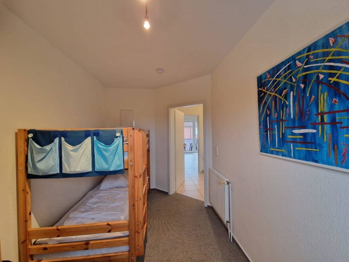 Die Wohnung verfügt über zwei Schlafräume: ein Schlafzimmer mit Boxspringbett und ein Kinderzimmer mit Etagenbett und Fernseher. Zusätzlich gibt es eine Schlafcouch im Wohnzimmer. Das moderne Badezimmer ist mit Dusche und WC ausgestattet.