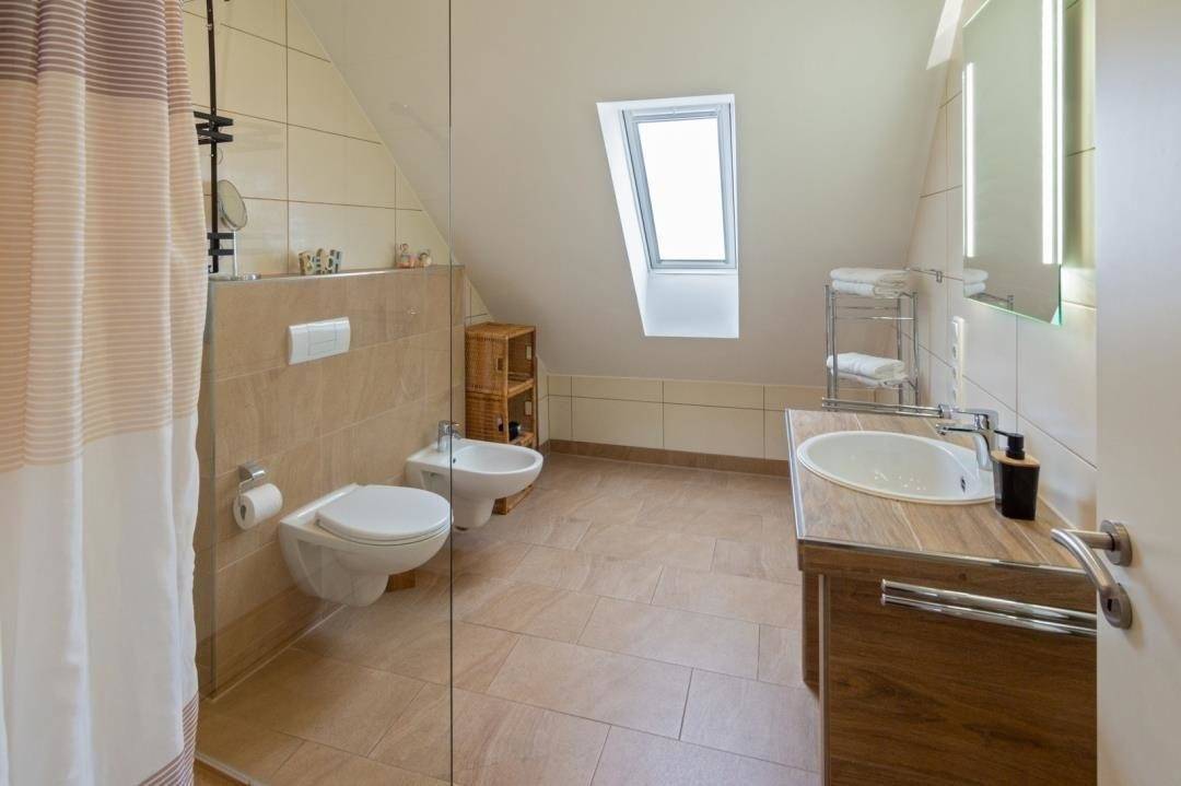 Badezimmer: das moderne Badezimmer bietet eine ebenerdige Dusche mit Glastüren, WC, Bidet und gemauertem Waschtisch – alles farblich abgestimmt.