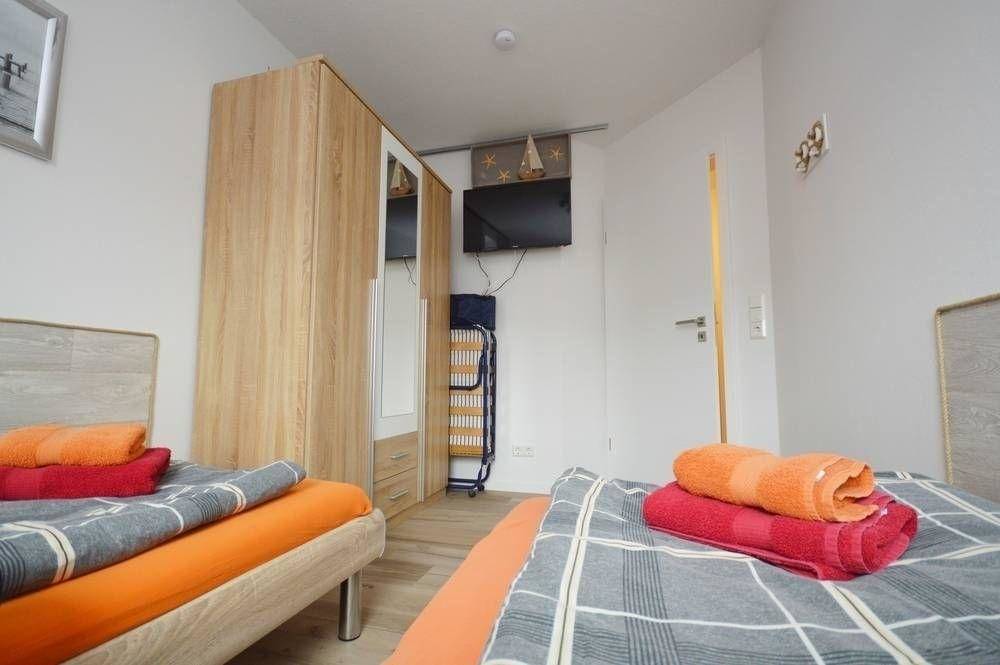 Von hier aus gelangen Sie in die einzelnen Zimmer, dass Schlafzimmer mit zwei Einzelbetten, dem Kleiderschrank, einer Garderobe und einem TV an der Wand.