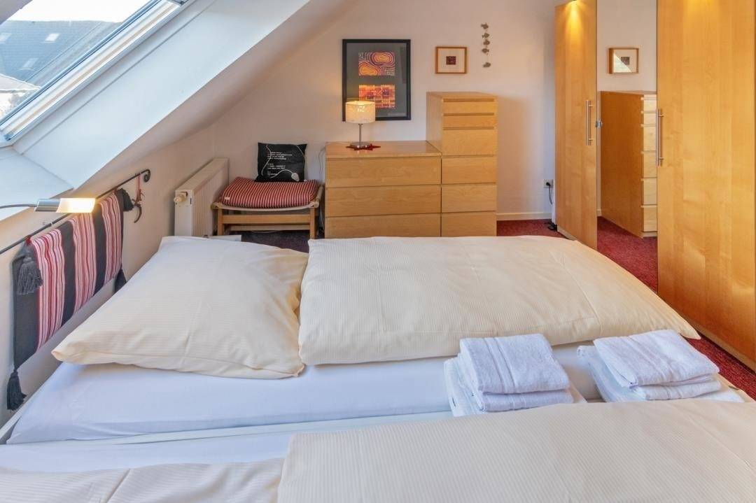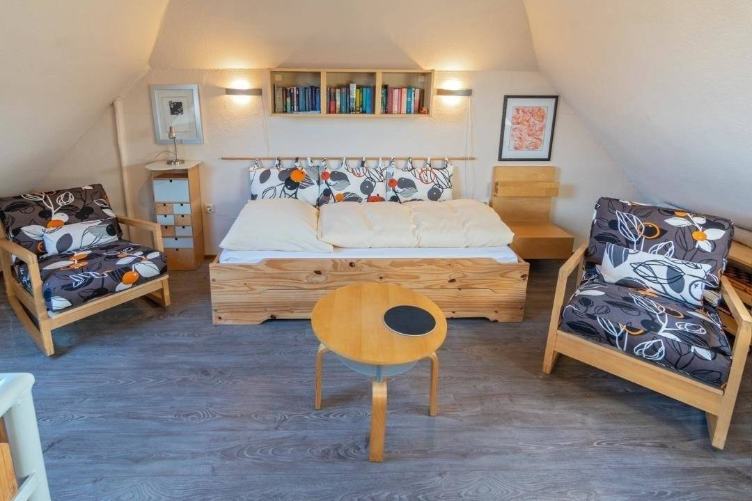 Das zweite Schlafzimmer befindet sich im ausgebauten Dachboden des Hauses und ist über eine schmale Wendeltreppe erreichbar. Hier erwartet Sie ein Einzelbett mit Standardmaß, ein kleiner Kleiderschrank, zwei Sessel und ein Schreibtisch. Es eignet sich hervorragend als Kinderzimmer.