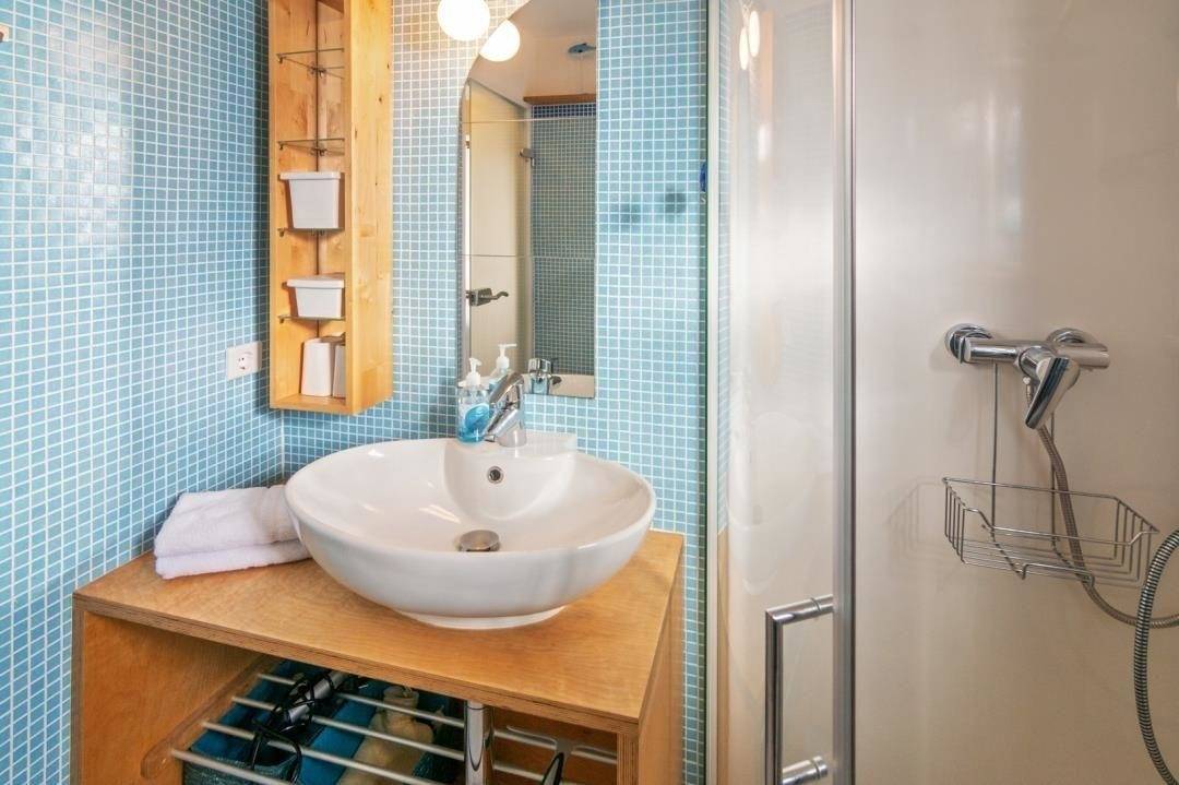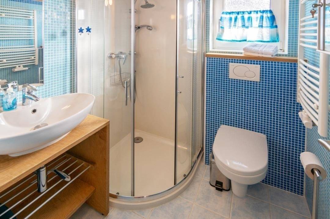 Das vorhandene Badezimmer verfügt über ein Tageslichtfenster und einer bodennahe Dusche, die ein bequemes Ein- und Aussteigen ermöglicht. Neben WC, Waschbecken, Spiegel und Ablagemöglichkeiten für Ihre Hygieneartikel und Kulturtaschen, finden Sie hier ebenfalls einen kleinen Erste-Hilfe-Schrank und ein Fön liegt ebenfalls für Sie bereit. Geheizt wird das Bad durch eine „Handtuchheizung" und ist durchgängig gefliest.