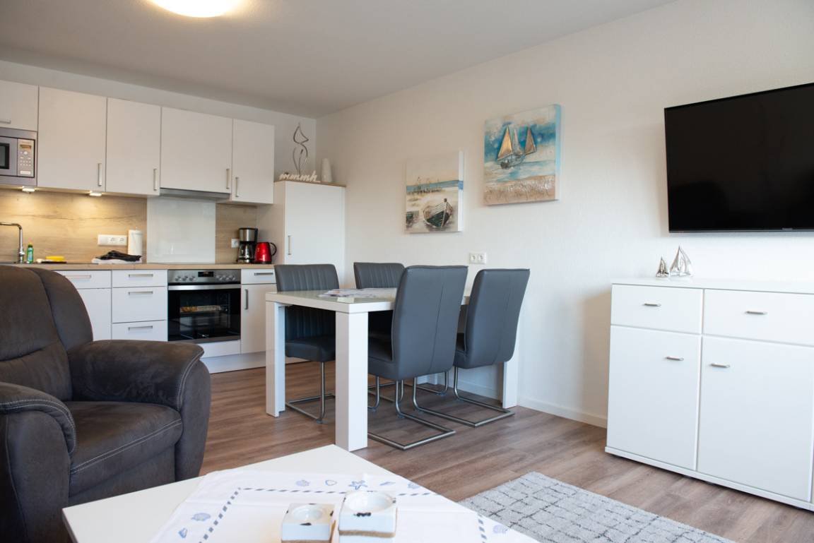 Wohn/Esszimmer mit Einbauküche, gemütlicher Garnitur sowie Esstisch und Stühle* Fernseher