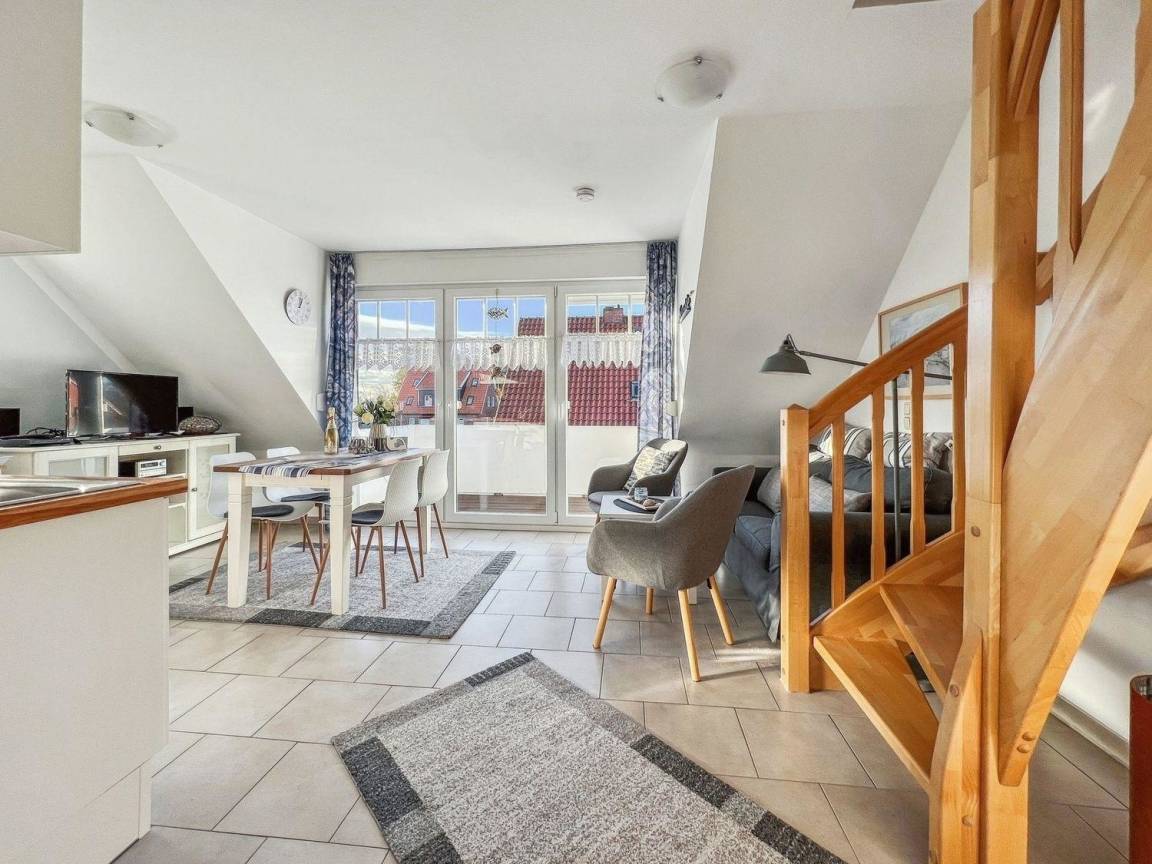 Auf 62 m² bietet die Obergeschosswohnung alles, was Sie für einen komfortablen Aufenthalt benötigen: eine offene Wohnküche im maritimen Stil, ein modernes Tageslicht-Badezimmer mit ebenerdiger Dusche und WC, ein Elternschlafzimmer auf der gleichen Etage mit Doppelbett (1,80 x 2,00 m) und TV sowie einen praktischen Abstellraum.
