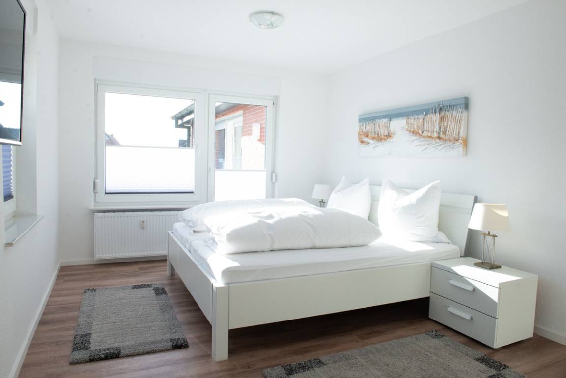 Die Ferienwohnung Deichnähe E liegt im 1.OG, verfügt über zwei getrennte Schlafzimmer, davon ist ein Schlafzimmer mit Doppelbett, Sat/TV, Außenrolladen und das zweite Schlafzimmer mit einem weiteren Doppelbett und Verdunklungs.-Plissees ausgestattet.