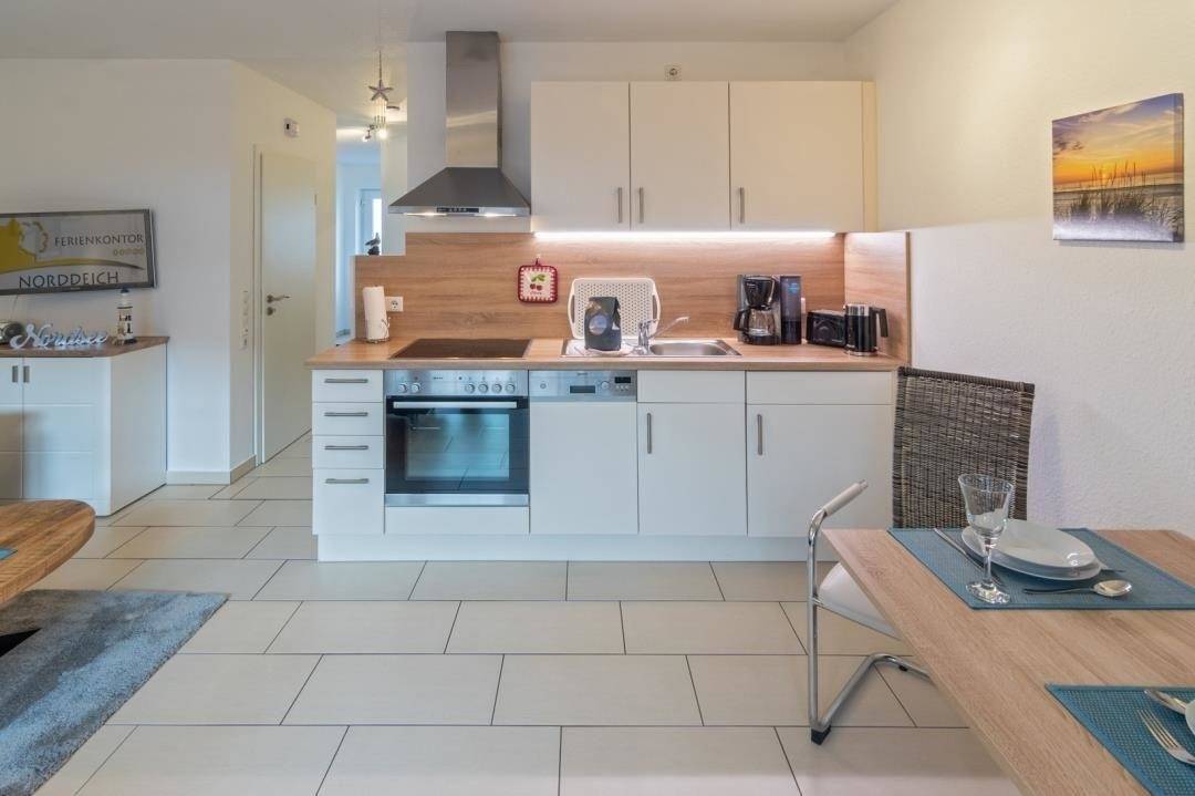 Die modern eingerichtete Küche rundet das Gesamtbild dieses offenen Raumes ab. Hier finden Sie einen Vier-Platten-Herd mit Backofen, einen Kühlschrank, eine Mikrowelle und eine Spülmaschine. Natürlich sind auch eine Kaffeemaschine und ein Toaster vorhanden. Ausgestattet mit Geschirr und Gläsern können Sie an einem Tisch mit zwei Stühlen gemütlich Ihren Kaffee oder Tee trinken und ein Stück Torte von einem der heimischen Bäcker oder Ihr selbst zubereitetes Essen genießen, wenn Sie einmal keine Lust haben auszugehen.