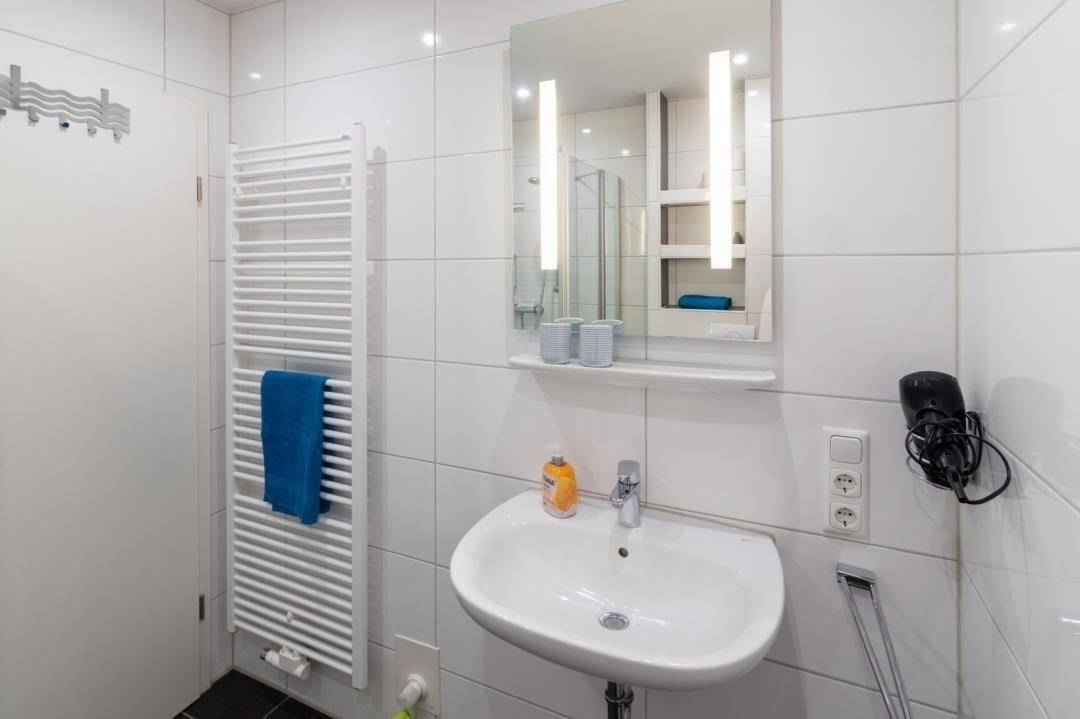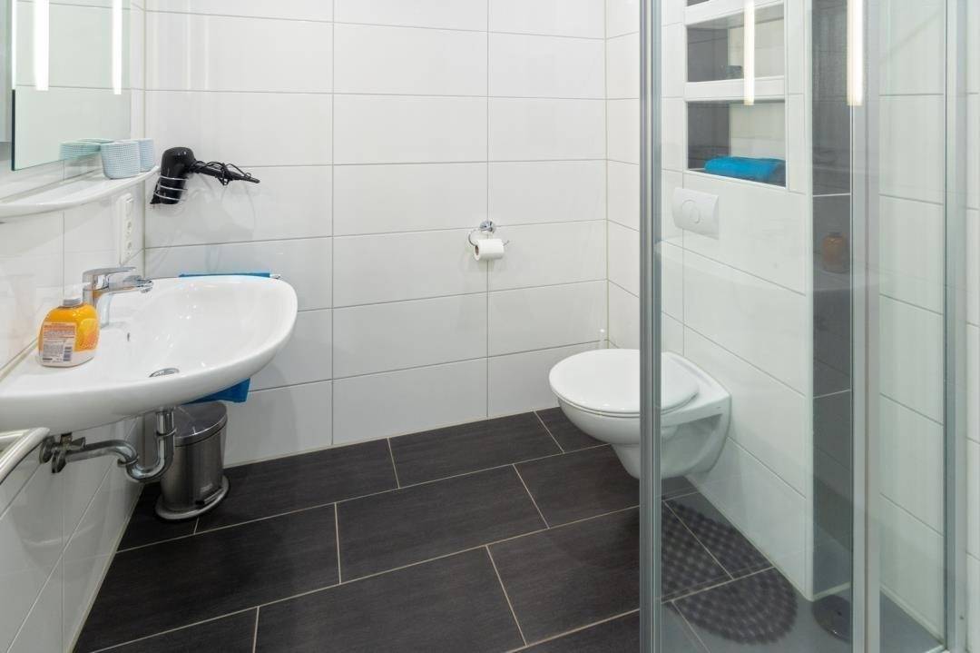 Das moderne Badezimmer verfügt über eine bodennahe Dusche, die ein bequemes Einsteigen garantiert, ein WC und natürlich einen Spiegel.